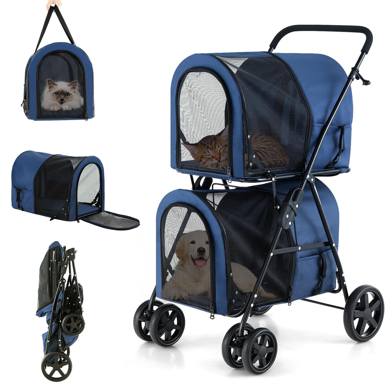 Hondenwagen, kattenwagen met afneembare drager, dubbele huisdierdrager voor kleine middelgrote honden katten jogger/reizen/camping, 4-in-1 doggy huisdier kinderwagen, vouwtrolley voor multi-pet huis, marine, marine