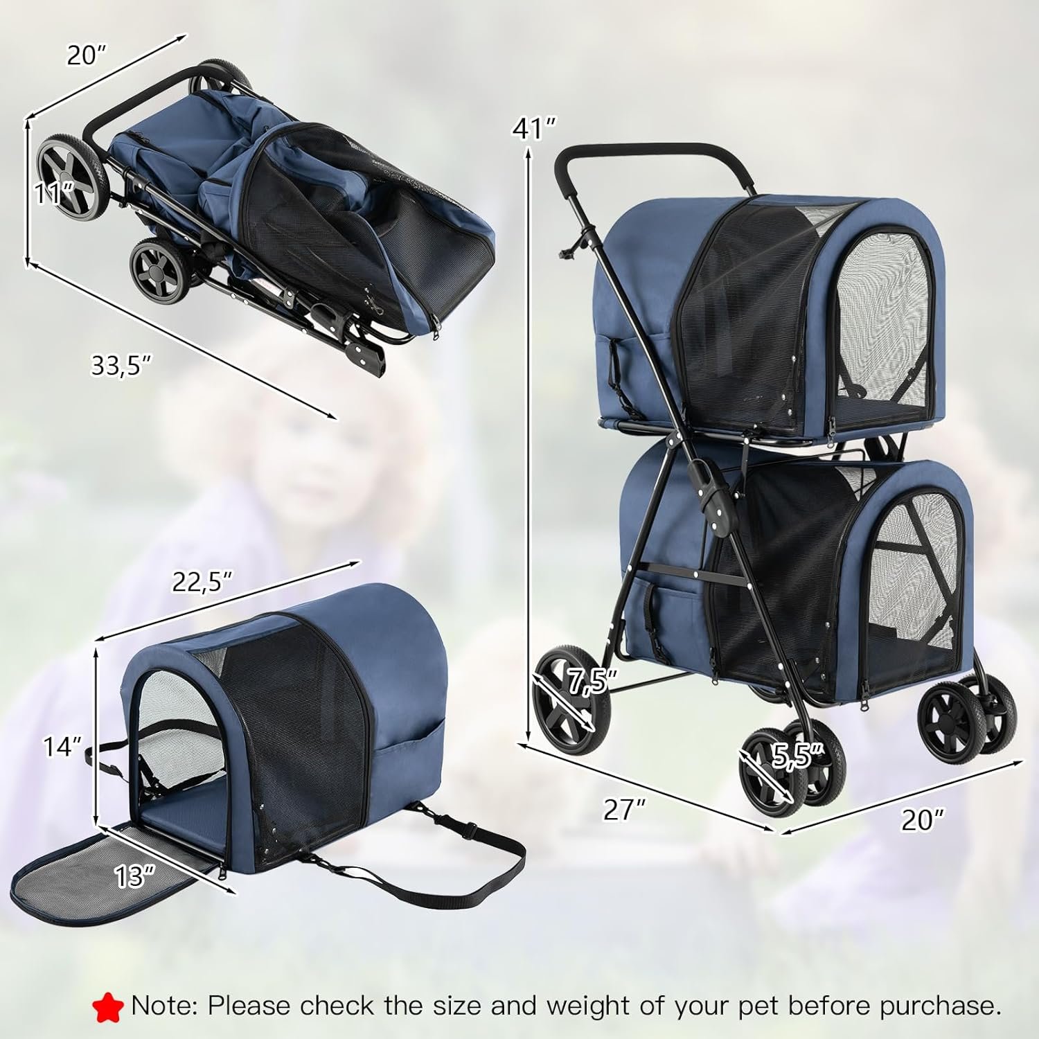 【Comfort voldoet aan de duurzaamheid】 De vulling is zacht en machinewasbaar. De ketting met voldoende vulling houdt uw huisdier comfortabel op zijn plaats. De mesh -cover biedt uitstekende zichtbaarheid en bescherming, terwijl je hond een cool briesje laat genieten. Gecombineerd met een stevig stalen frame en bedekt met premium Oxford -doek, is deze dubbele kinderwagen -kinderwagen duurzaam en geschikt voor een verscheidenheid aan huisdieren. De draagtas meet 13 “x 14” x 22,5 “en het maximale gewicht per hondenwagenzak is 17 pond (8 kg).