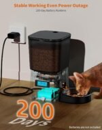 (Dubbele voeding) De getimede kattenvoeder kan worden aangedreven door USB-stroomadapter en 3 alkalische D-size-batterijen (niet inbegrepen). Zodra het voedingsschema is ingesteld, wordt het elke dag herhaald. In het geval van een stroomstoring wordt de automatische feeder automatisch overschakeld naar batterijvermogen. Om veiligheidsredenen wordt het aanbevolen om batterijvermogenbronnen te gebruiken. Batterij alleen kan de stroom leveren gedurende 200 dagen. Ik hoeft zich geen zorgen te maken dat uw huisdier hongerig gaat terwijl u weg bent.