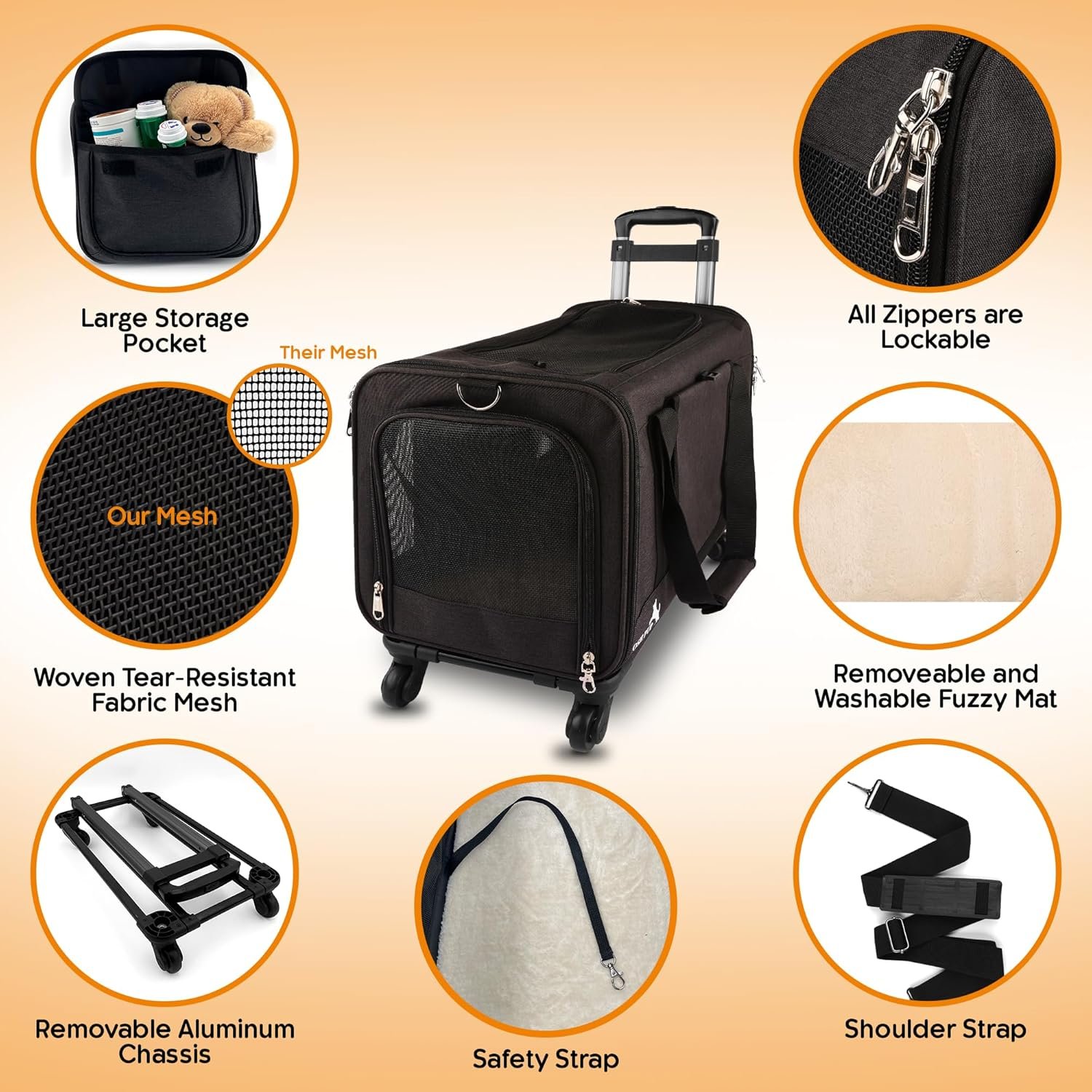 Veelzijdig en handig ontwerp: gebruik de drager als een op zichzelf staande tas met de meegeleverde schouderriem of bevestig deze aan de trolley voor het rollen. Onze drager omvat een grote opslagzak voor benodigdheden, met een wasbare fuzzy mat en een beveiligingsriem in de carrier. Geschikt voor lucht- en grondreizen, kamperen en elke dag gebruiken, zoals het meenemen van huisdieren naar veterinaire bezoeken en reizen naar de trimmer.