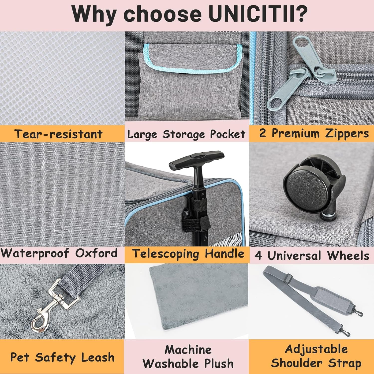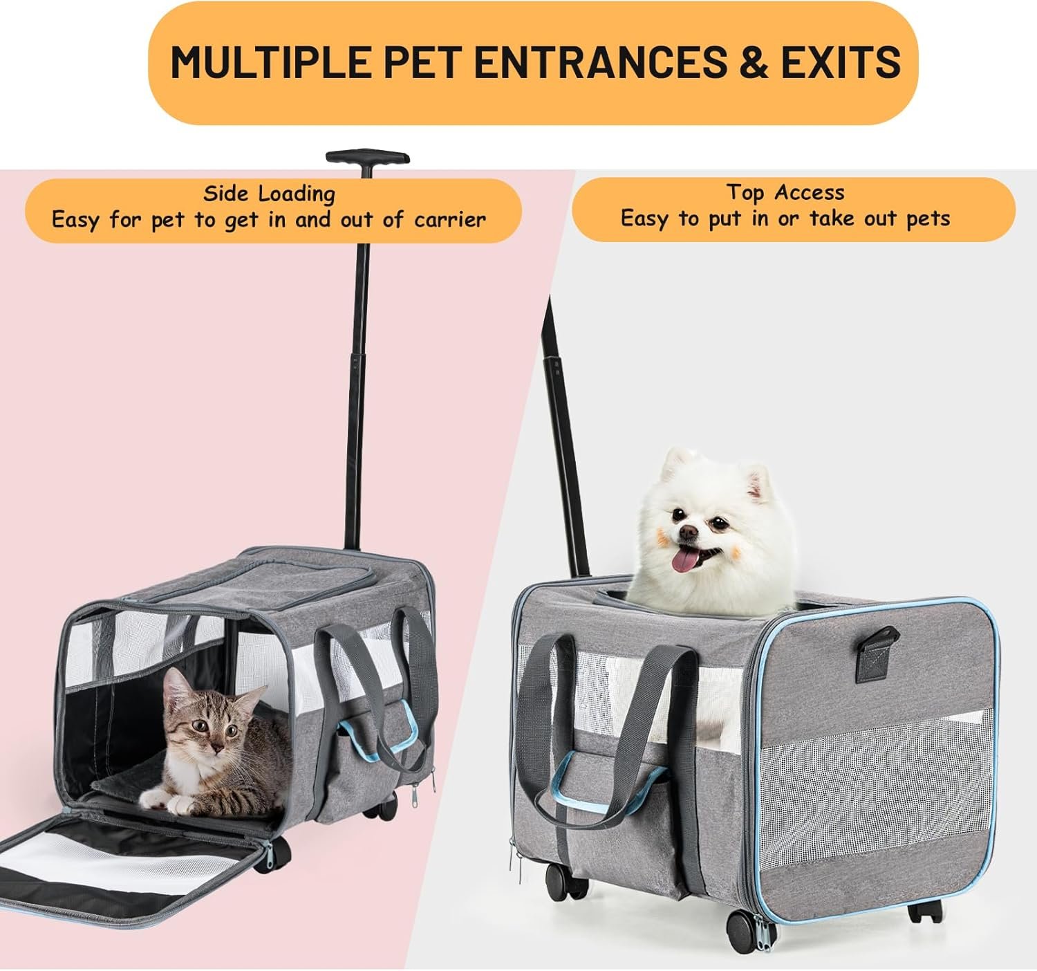 【Wielen draaien en schuiven gemakkelijk】- Deze rollende huisdierdrager met wielen heeft een verwijderbaar metaalplatform met twee 360 graden stille draaikolk voorwielen en twee vaste achterwielen voor extra stabiliteit. Deze structuur zorgt ervoor dat uw huisdier een soepele en veiligheidsreis ervaart. En een telescopische handgreep maakt het handig voor reizigers die door luchthavens lopen.