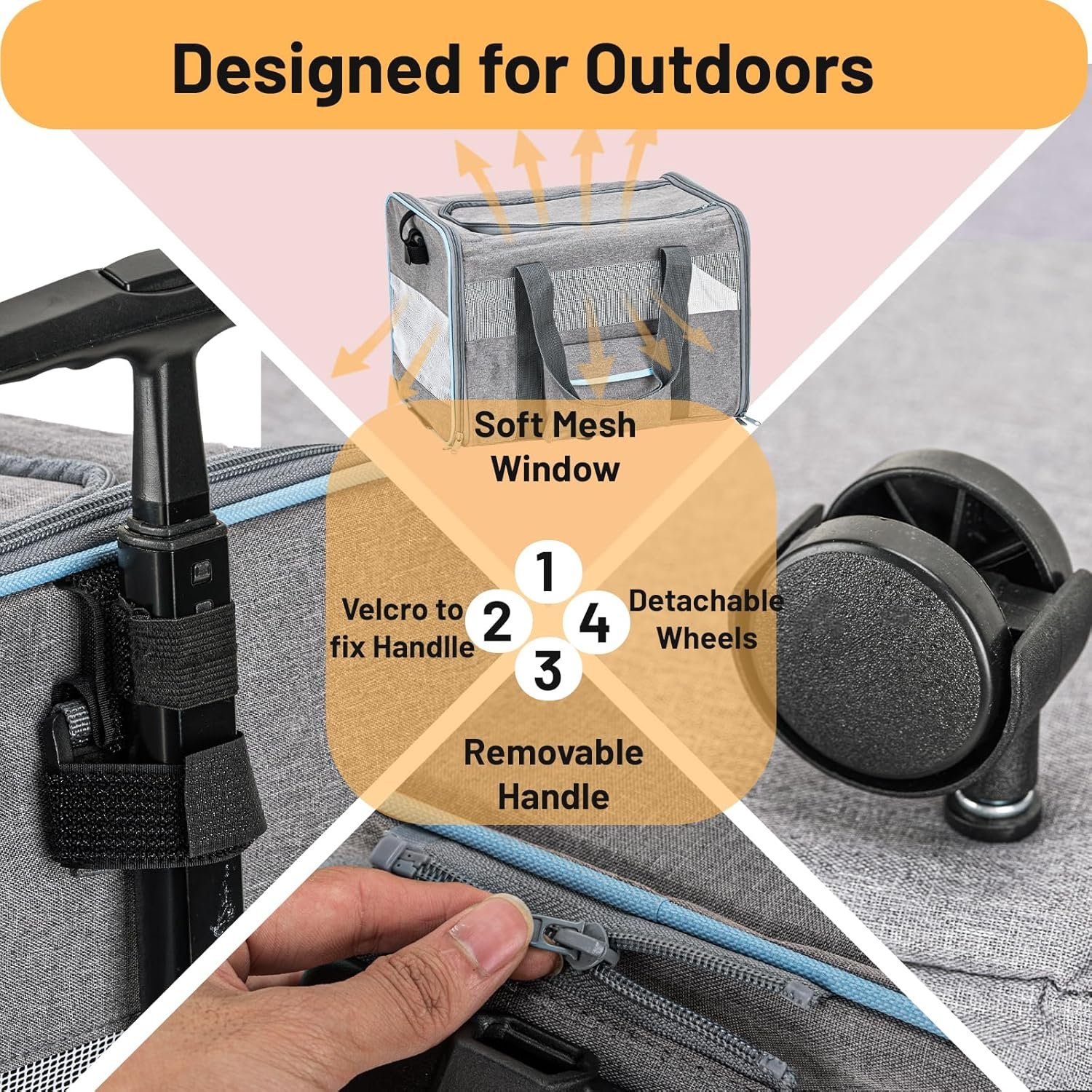 Huisdierdrager voor kleine hondenkat, door luchtvaartmaatschappij goedgekeurde hondendrager met wielen zachte zijdige hond rollende krat katten reistas tot 20 lbs huisdier kinderwagens voor kleine huisdieren (grijs-met wielen)