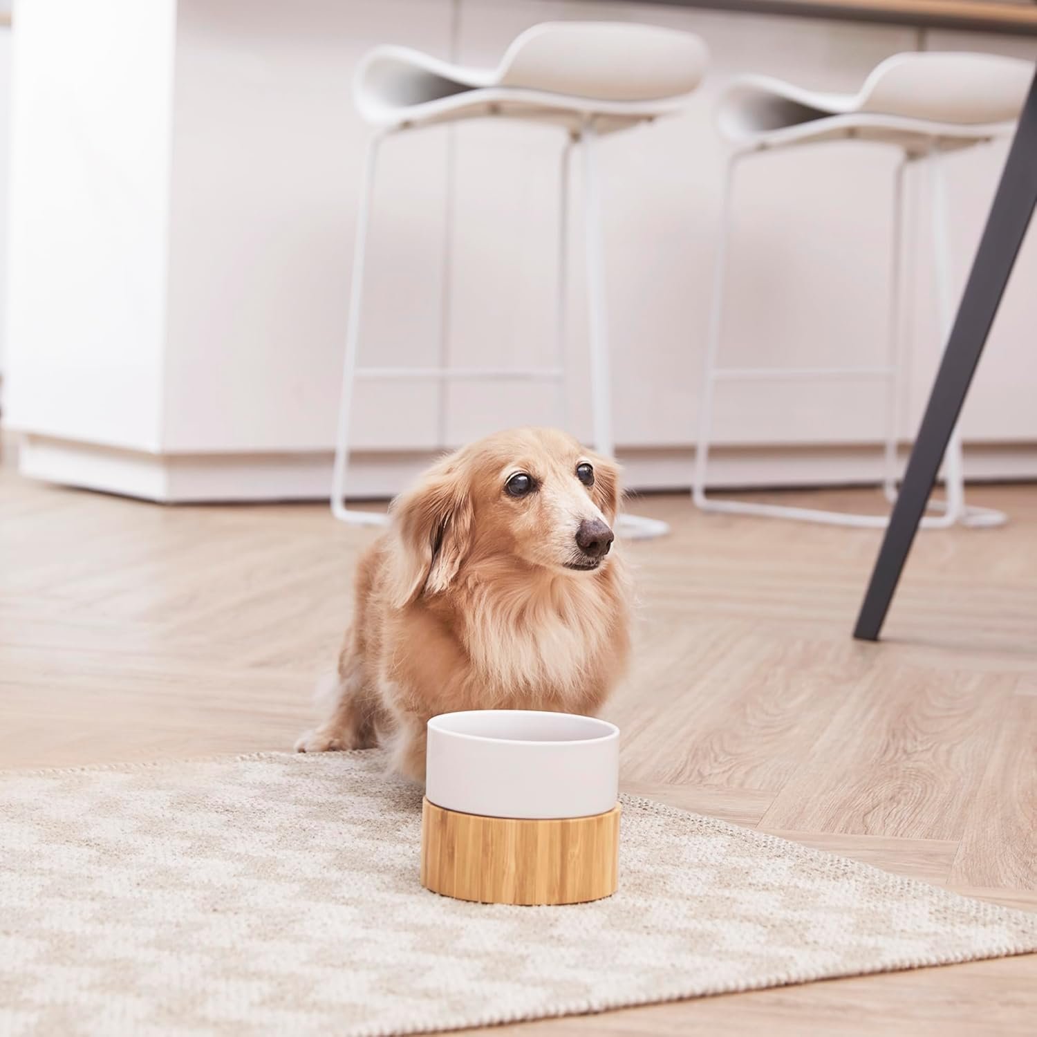 Morsbestendig: de gewogen bamboestand voorkomt dat huisdieren een dudgingkom en de inhoud morsen, terwijl niet-slippads op de bodem ook helpen de feeder op zijn plaats te houden en uw vloer beschermt.
