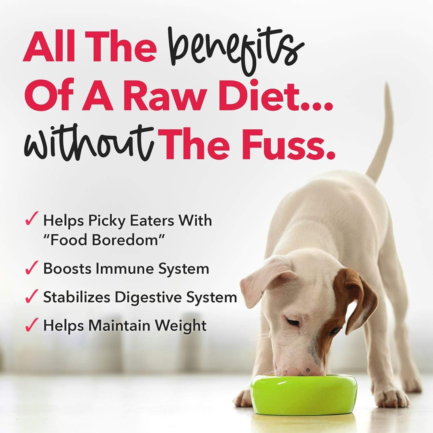 Vers en voedzaam: verdeel de brokken van uw pup met verse en voedzame gelukkige, gezonde hondenvoedseltoppers. Uw pup haalt het meeste uit elke maaltijd met deze hondenvoertopper die wordt bevriend om voedingsstoffen te behouden en heeft probiotica ingeroerd na vriesdrogen om hun levensvatbaarheid te behouden.