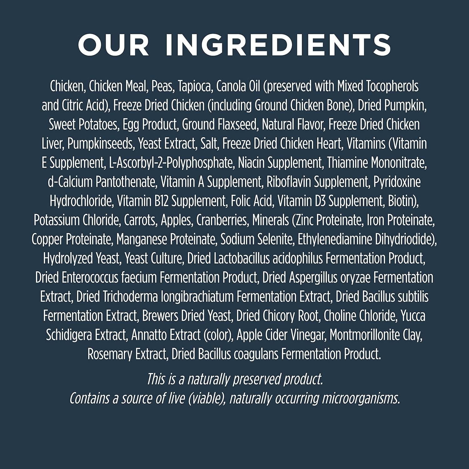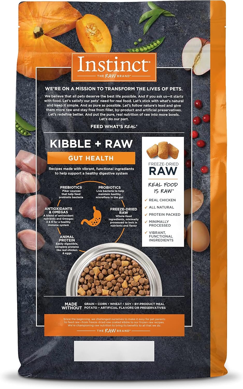 Hoog eiwit, korrelvrije brokken plus gevriesdroogde rauw, instinct rauw boost korrelvrij recept met echte kip voor darmgezondheid is een betere manier om te voeden. Recepten gemaakt met levendige, functionele ingrediënten om een ​​gezond spijsverteringssysteem te ondersteunen. Ontgrendel het potentieel van uw hond om te gedijen en stop meer van de pure, echte voeding van RAW in elke kom. Boosted voeding op maat gemaakt voor darmgezondheid-korrelvrije, hoog eiwitbrokken + gevriesdroogd rauw. Overtrof een best verkochte, door dierenartsen aanbevolen merk en formule voor gevoelige maag en huid in een onafhankelijk onderzoek. Een mix van prebiotica en probiotica die samenwerken voor gezonde microflora in de darm. Recepten beginnend met kooivrije kip en boordevol dierlijke eiwitten. These easily digestible, complete proteins are easy on your pet’s stomach A blend of antioxidants & Omegas for a healthy immune system essential in overall digestive health Freeze-Dried Raw – All natural, protein packed, minimally processed bites of real chicken with vibrant, functional ingredients IngredientsChicken, Chicken Meal, Peas, Tapioca, Canola Oil (preserved with Mixed Tocopherols and Citric Acid), Freeze Dried Chicken (including Ground Chicken Bone), Dried Pumpkin, Sweet Potatoes, Egg Product, Ground Flaxseed, Natural Flavor, Freeze Dried Chicken Liver, Pumpkinseeds, Yeast extract, Salt, Freeze Dried Chicken Heart, Vitamins (Vitamin E Supplement, L-Ascorbyl-2-Polyphosphate, Niacin Supplement, Thiamine Mononitrate, d-Calcium Pantothenate, Vitamin A Supplement, riboflavine -supplement, pyridoxine hydrochloride, vitamine B12 -supplement, foliumzuur, vitamine D3 -supplement, biotine), kaliumchloride, wortelen, appels, cranberries, mineralen (zinkproteïne, ijzerproteïne, ijzeren proteïne, copperiate, mangere proteïne, mangaande proteïne, mangaande proteïne, mangere proteïne, mangere proteïne, mangaande proteïne, mangaande proteïne, mangere proteïne -proteïne -proteïne -proteïne -proteïne, copperiaat, copperieur, natrium -seleniet, ethyleediamine dihydriodide), ethydriodide) Gehydrolyseerde gist, gistcultuur, gedroogd lactobacillus acidophilus fermentatieproduct, gedroogd enterococcus faeciumfermentatieproduct, gedroogd Aspergillus oryzae fermentatie -extract, DRI, DRI