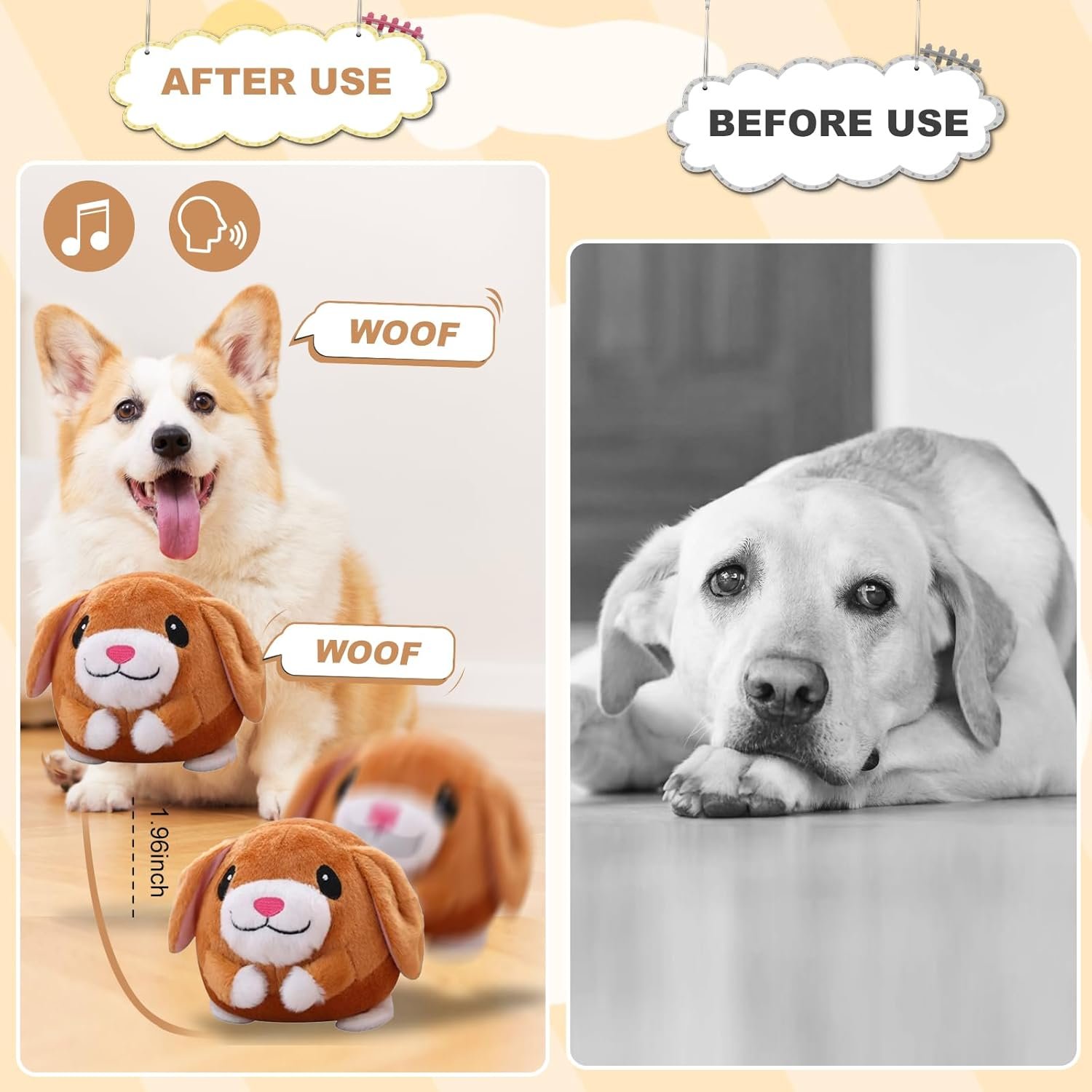 ????【 Oplaadbare hondenspeelgoed】 Na 30 minuten opladen met de meegeleverde laadkabel kan de springkus ongeveer een uur continu stuiteren. Deze stuiterende bal voor honden wordt geleverd met een schattig bruin puppy -uiterlijk, dynamische muziek en prachtige melodische geluiden, die de interesse van je hond in het spelen zullen vergroten.