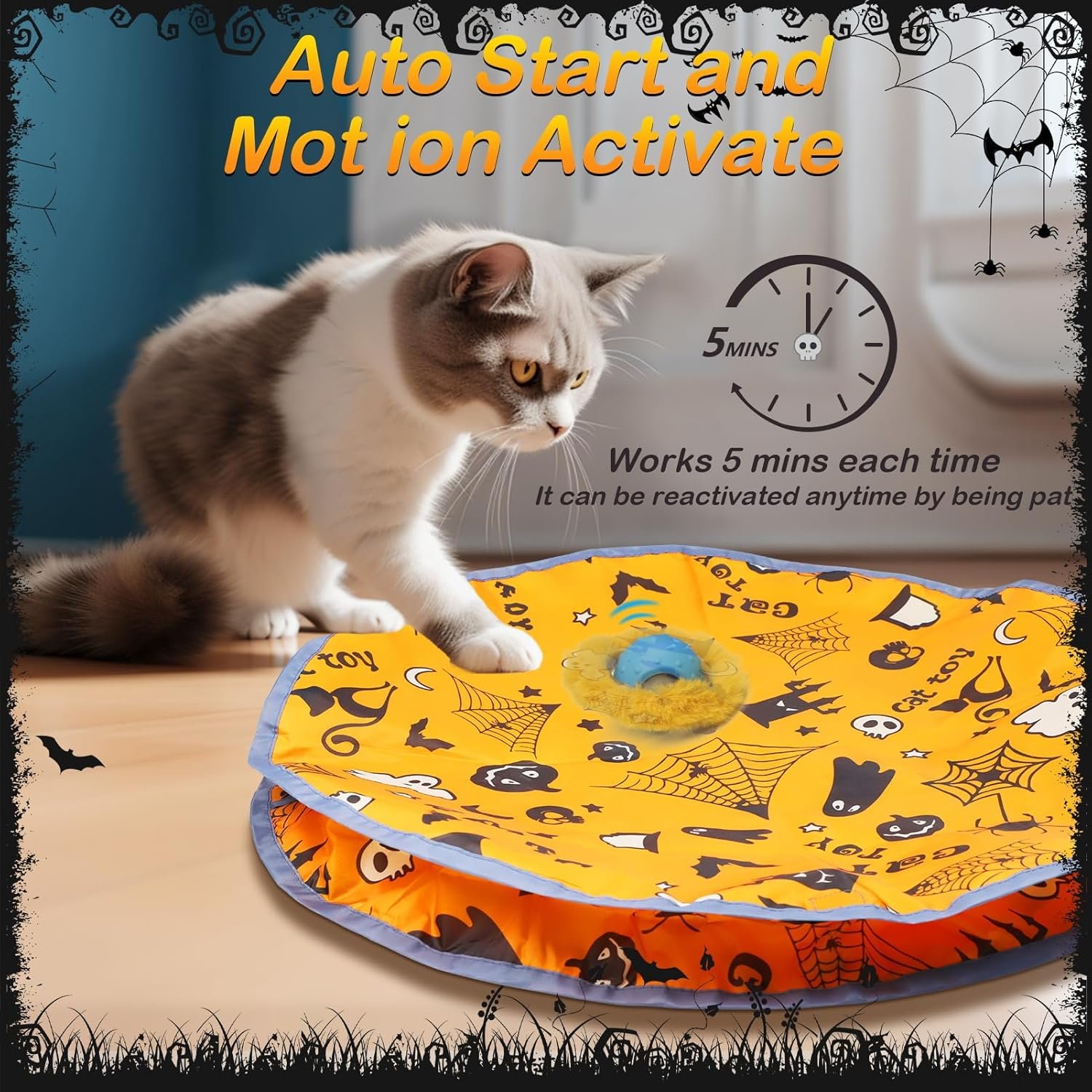 Auto aan/uit en beweging geactiveerd: stroom op het automatische kattenspeelgoed werk 5 minuten en voer vervolgens de standy -status in, het wordt opnieuw geactiveerd door te zijn. Als er geen aanraking tijdens de standby -tijd is, zal het automatisch elke 1 uur reactiveren voor 60 uur om aan te trekken om aan te trekken de aandacht van katten.