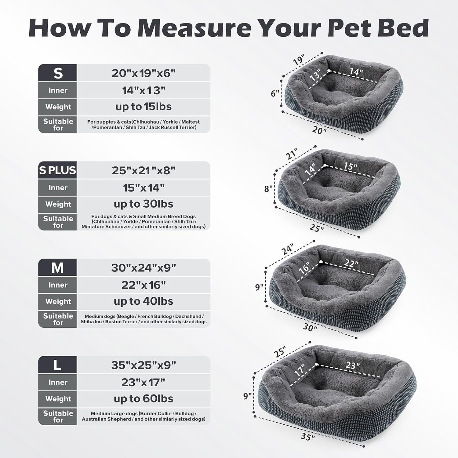Volgens details: klein hondenbed voor kleine honden of katten tot 15 pond, de buitenste grootte is 20 “x19” x6 “; kleine middelgrote hondenbed voor huisdieren tot 30 pond, de buitenste grootte is 25” x21 “x8”; Medium hondenbed voor middelgrote honden tot 40 pond, de buitenste grootte is 30 “x24” x9 “; groot hondenbed voor grote honden tot 60 pond, de buitenste grootte is 35” x25 “x9”; Zorg ervoor dat u de maat bevestigt.