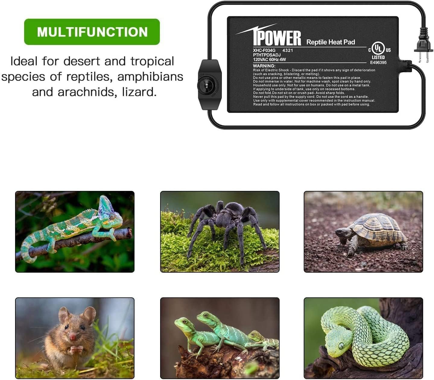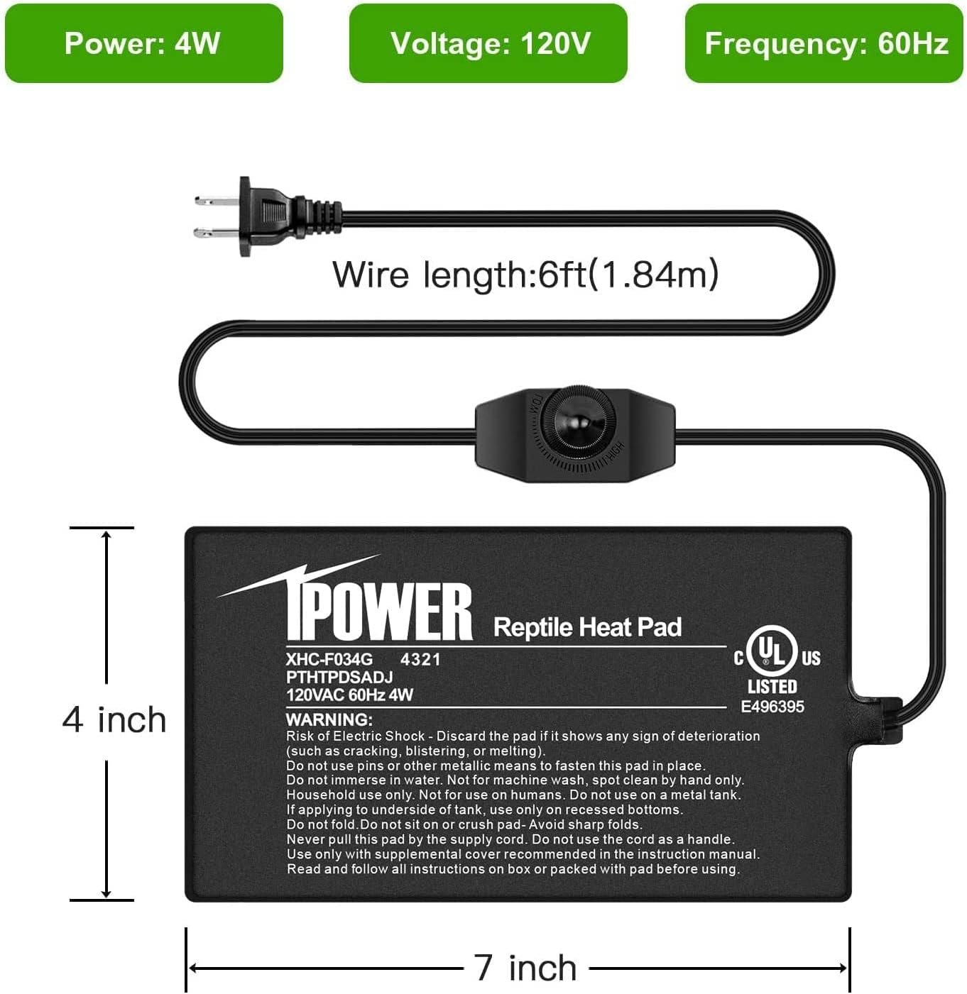 Specificaties: 4 x 7 “maat, 120 volt, 4 watt, 6 ft netsnoer. Pakket inbegrepen: 1 pack 4” x 7 “reptielenverwarmingsmat met temperatuurregelaar; 1 pack LCD digitale aquariumthermometer.