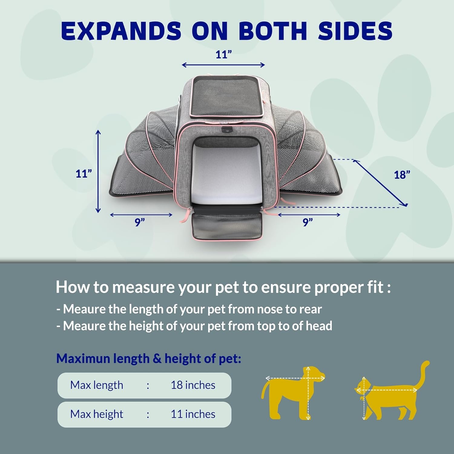 Breidt aan beide zijden uit: de drager kan aan beide kanten groter worden en uw huisdier meer ruimte geven om te bewegen. Er is gaas aan de zijkanten, zodat uw huisdier u kan zien, wat hen helpt zich kalm te voelen