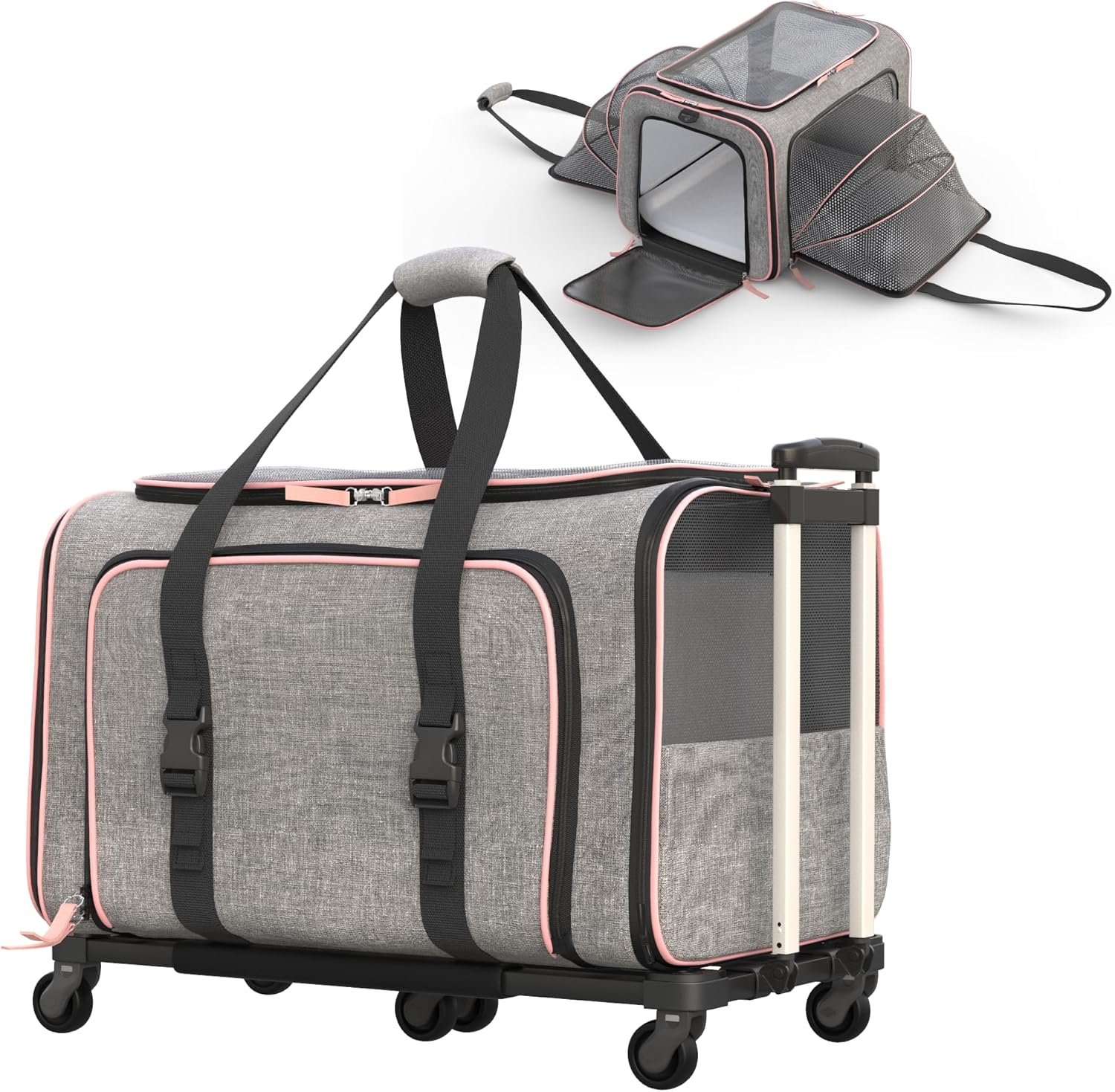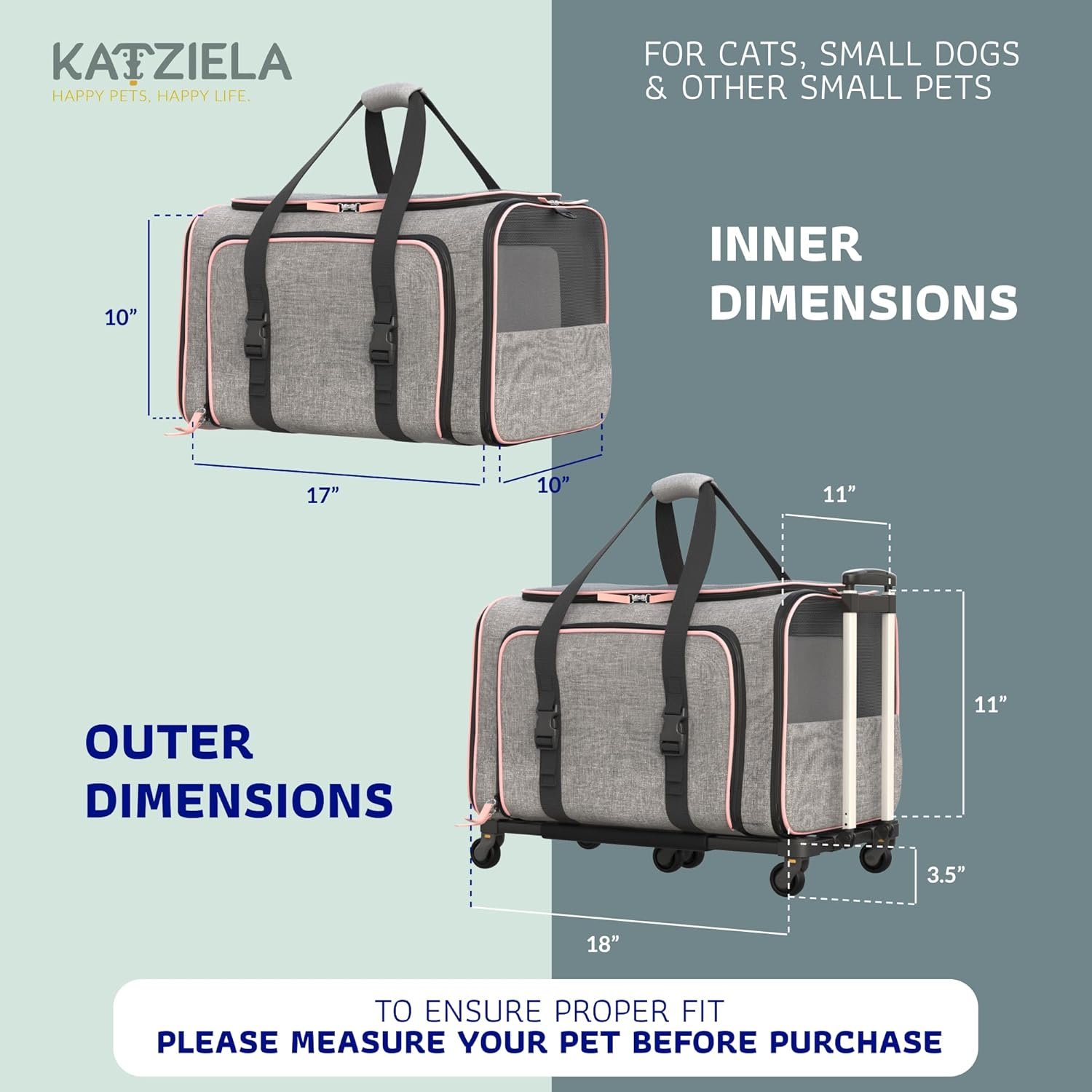Katziela Rolling Rover Airline Compliant Expandable Premium Pet Carrier 6-Wheeled Button Telescopic Hendel Tweezijdige uitbreidbare Rolling Carrier ontworpen (grijs roze leidingen)