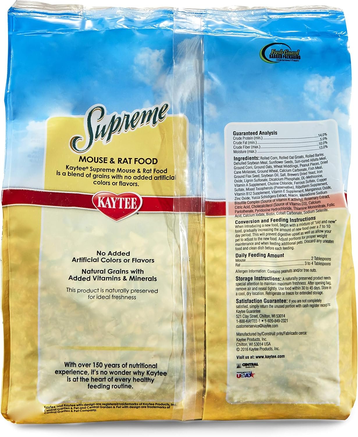 Kaytee Supreme Mouse en rattenvoedsel is een gezonde, hoogwaardige mix die alle natuurlijke eiwitten, vezels, oliën en voedingsstoffen van volle granen bevat. Versterkt om een ​​evenwichtsmix te garanderen, gebruikt Supreme natuurlijke zaden, granen en pellets om uw kleine huisdier een eenvoudig maar gezond dieet te voorzien. Kaytee Supreme biedt ingrediënten van hoge kwaliteit kleine dieren liefde en de voeding die ze nodig hebben. Kaytee begrijpt dat het delen van je leven met een klein huisdier niet alleen plezierig is, maar ook erg verrijkend is. Kaytee toont onze liefde door ervoor te zorgen dat we uw kleine huisdier de beste voeding bieden voor een lang en gezond leven. Met meer dan 150 jaar voedingservaring is het geen wonder waarom Kaytee de kern vormt van elke gezonde voedingsroutine.