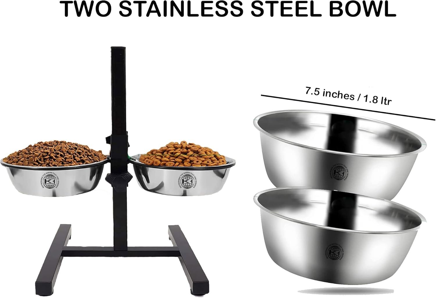 Bevat: 2 x roestvrijstalen huisdierenkommen met een verstelbare standaard. Bowl -afmetingen: 8,5 ”, 1,5Ltr volume.