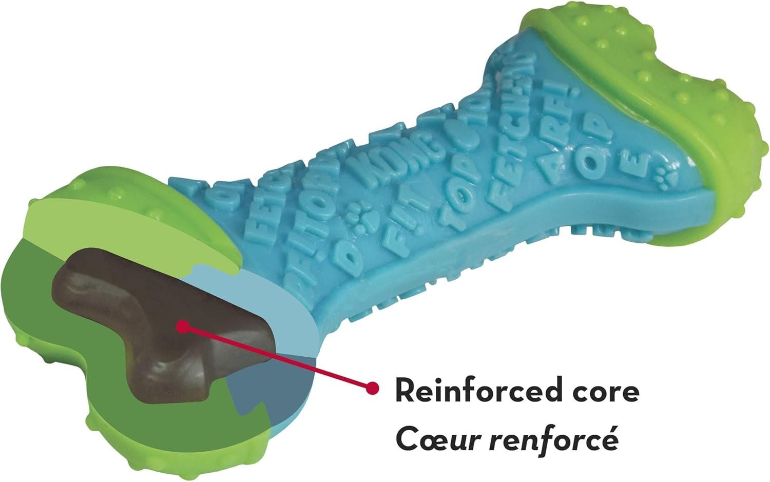De versterkte lagen in de kern voegen extra taaiheid toe waardoor het geweldig is voor kauwers. De externe textuurwoorden dragen bij aan het plezier en hebben het extra voordeel van het reinigen van tanden en tandvlees.