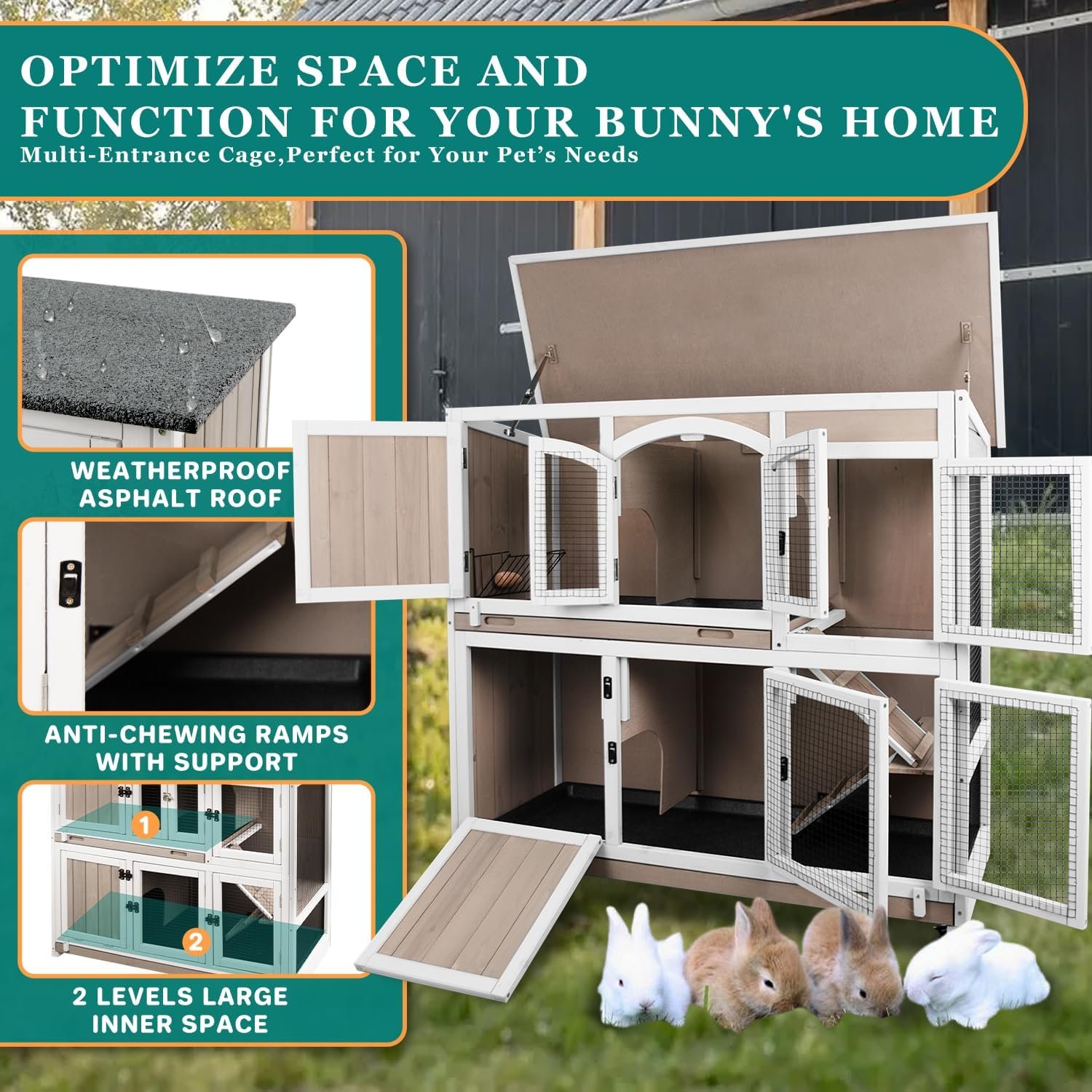 Veilige habitat met 4 toegangsdeuren: binnenhok is omgeven door beschermende draadmazen die uw konijntjes voor het buitenleven voorkomen, bieden ook uitstekende ventilatie. 4 Verschillende zijden Access Deuren stellen uw huisdieren in staat om gemakkelijk in en uit te gaan, en handige voeding en interactie met uw huisdieren.