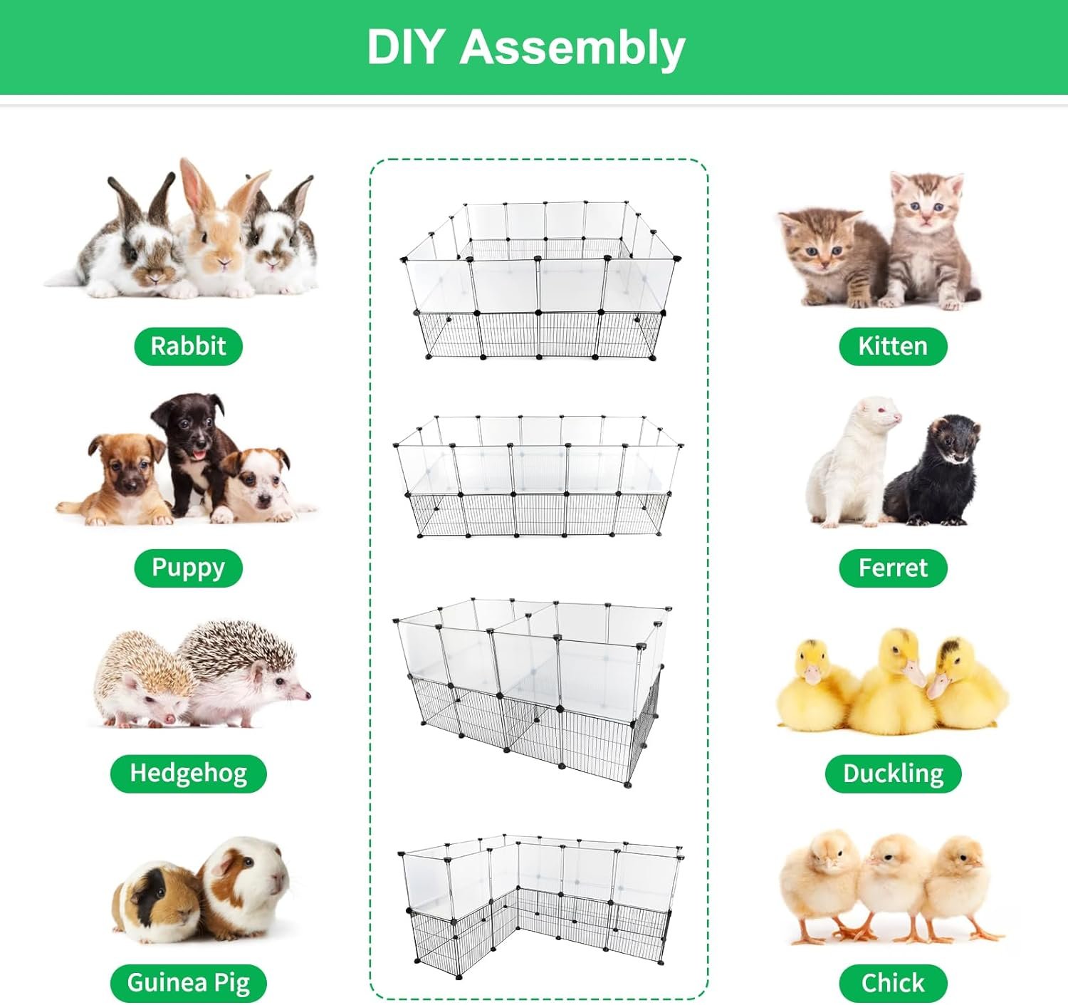 DIY Fence Design: je kunt ze indien nodig in verschillende vormen monteren, een warme habitats bouwen voor je kleine dieren en ervoor zorgen dat ze voldoende ruimte hebben om te spelen en te oefenen, en meerdere sets producten kunnen worden gestapeld en gebruikt; U kunt uw verbeelding gebruiken om verschillende assemblagemethoden voor uw huisdier te maken
