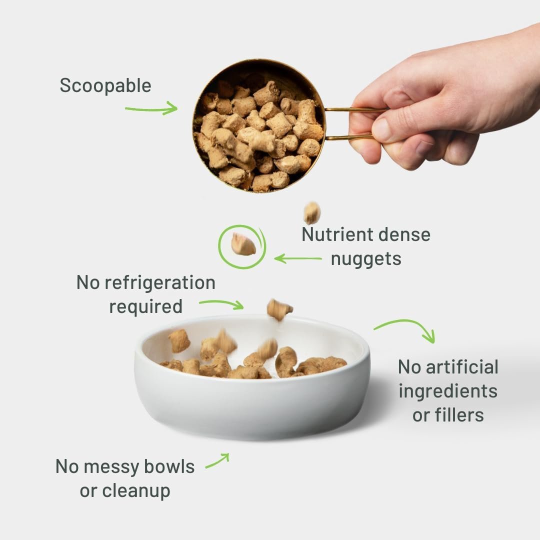 Maximale voedingsstoffen: ons vriesdrogende proces verpakt de maximale voordelen van verse, rauwe ingrediënten in voedingsrijke nuggets met de perfecte balans tussen koolhydraten, vetten, eiwitten en vezels. Ons mix van probiotica en low-heat proces levert een industrie van 99% verteerbaarheidsverhouding, wat betekent dat uw hond alle voedingsstoffen absorbeert