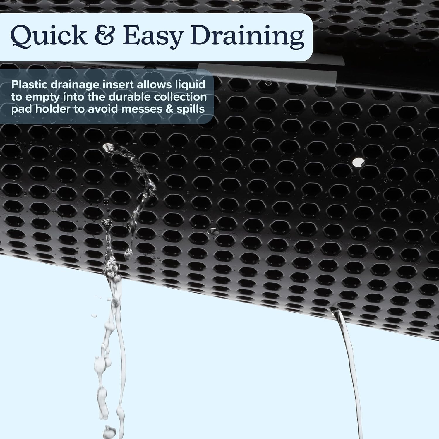 Drie -laags systeem – De kunstmatige hondengrasmat zit bovenop een veilige plastic drainage -inzetstuk waarmee vloeistof in de duurzame collectie puppypadhouder kan legen om rommel en morsen te voorkomen.
