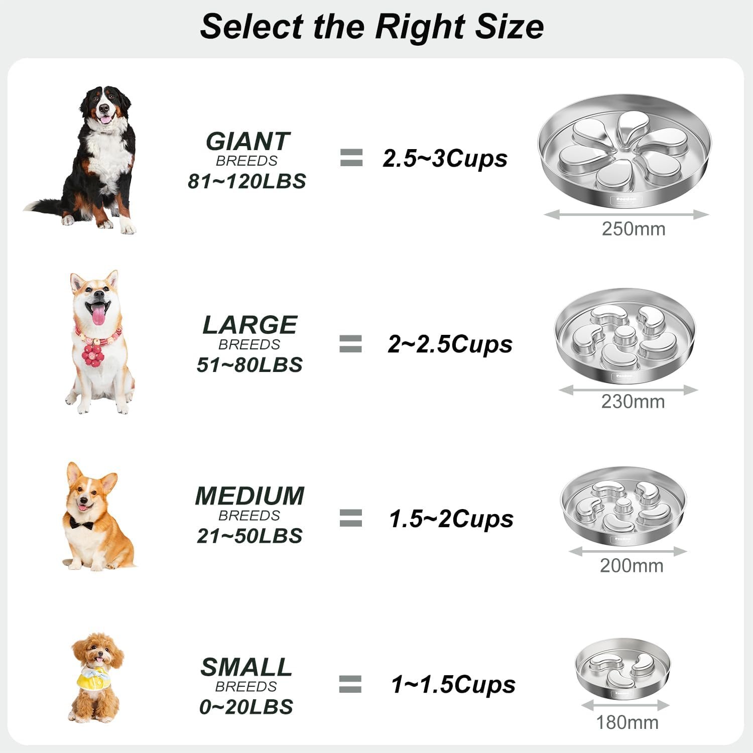 3Cups Grote hondenkommen: meten 9.8”x9.8”x1.8 ”, onze roestvrijstalen hondenkommen kunnen maximaal 3cups droog voedsel bevatten, geschikt voor middelgrote en grote rassen. En het is ideaal voor het serveren van droog, nat en rauw voedsel, merkte op dat niet elke “beker” van huisdierenvoeding hetzelfde is vanwege verschillende vormen