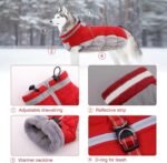 Reflecterende hondenjas met ingebouwde harnas: er is een reflecterende strook op de halslijn van de grote hondenjas, die uw hond in het donker kan plaatsen en ze veilig kan houden. Er zijn twee D-ringen aan de achterkant, die kunnen worden bevestigd aan een riem of kaktas