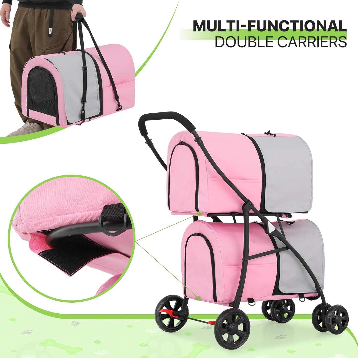 Magshion dubbele honden kinderwagen met 2 afneembare draagtassen, 4-wiel vouwen Pet Travel Wandelwagen met opbergvak voor kleine medium honden en katten puppy, roze grijs, roze grijs