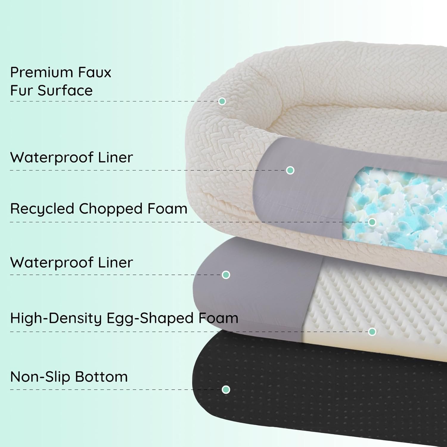 Was en zorg: gewoon uitpakken, vulstof verwijderen en machine de beddekking wassen. Belangrijke kennisgeving: ons menselijke hondenbed is vacuüm gecomprimeerd voor verzending. Nadat u de installatie hebt voltooid, kunt u minimaal 24 uur voor het bed zijn vorm herwinnen.