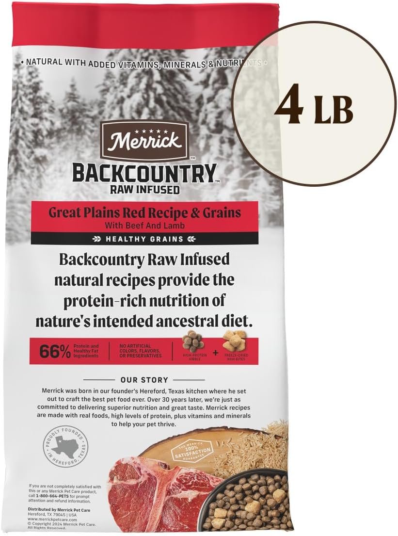 Verbind uw hond met een voorouderlijk dieet met Merrick Backcountry Healthy Grains, Great Plains Red Meat Recept. Real Deboned Beef is het eerste ingrediënt in dit natuurlijke, met toegevoegde vitamines, mineralen en voedingsstoffen, recept, een hoog eiwit hondenvoedsel dat helpt bij het handhaven van spiermassa en gezonde energieniveaus. Dit echte hondenvoedsel met rundvlees en lam bevat een holistische mix van brokken en gevriesdroogde rauwe stukken geïnspireerd door een voorouderlijk hondendieet en is vervaardigd om de smaak van rauw hondenvoer te bieden in een heerlijk en handig recept. Er zijn gemakkelijk verteerbare haver en gezonde ingrediënten opgenomen in dit droge hondenvoer met granenrecept om een ​​compleet en uitgebalanceerd volwassen hondenvoer te ondersteunen. Dit premium hondenvoer wordt gemaakt zonder aardappelen of linzen en bevat geen kunstmatige smaken of conserveermiddelen. Merrick Backcountry hondenvoerrecepten zijn met trots opgericht in Hereford, Texas, gemaakt in faciliteiten in de VS.
