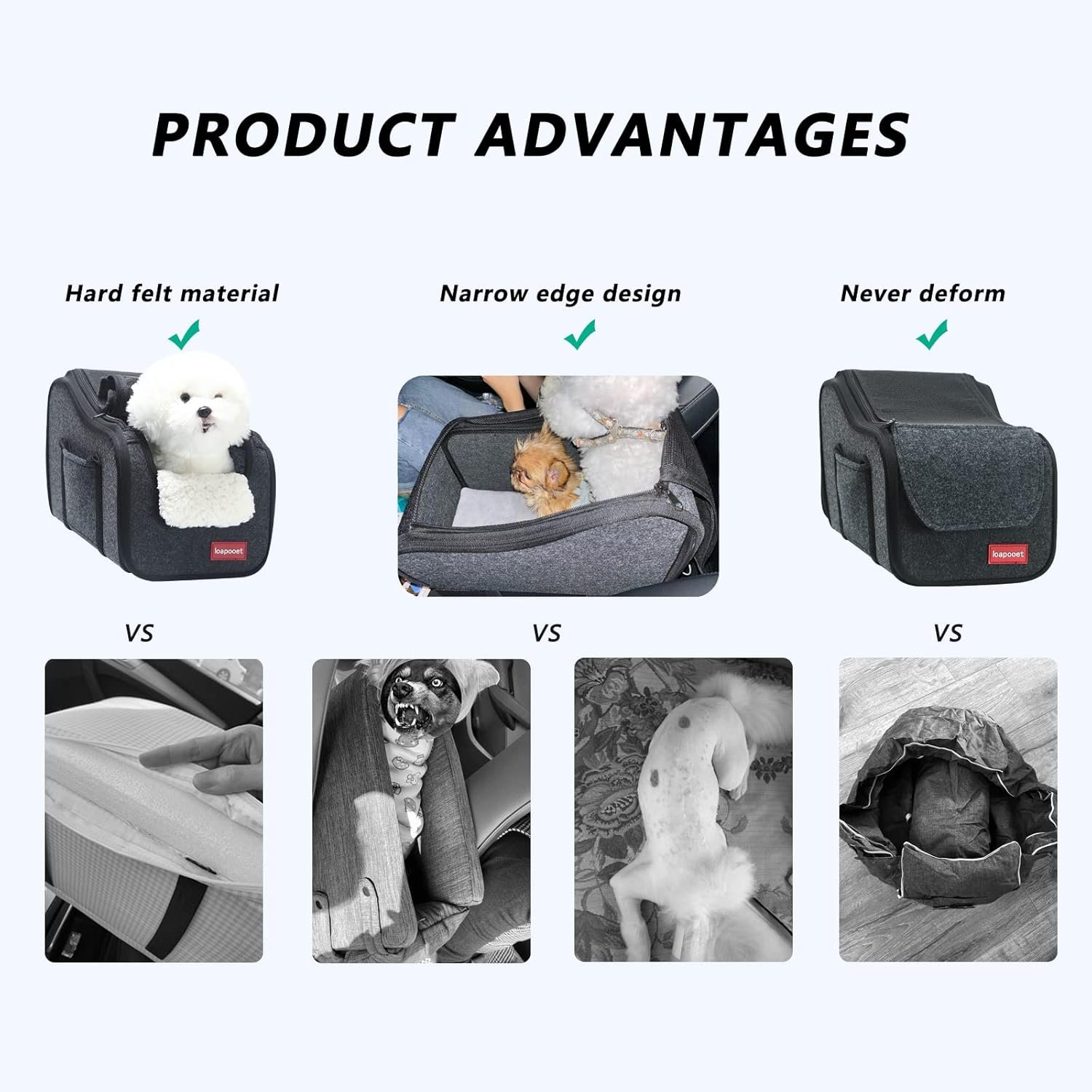 Grootte: de grootte van de hondenauto-zitplaats is 16,5 “L x 9,8” W x 7,5, die plaats biedt aan kleine en middelgrote honden en katten binnen 15 pond. Het product is gemaakt van vilt met hardheidsondersteuning, driedimensionale ondersteuning van uiterlijkmodellering, smal randontwerp van productrand, om een ​​grotere interne ruimte van tas te bereiken
