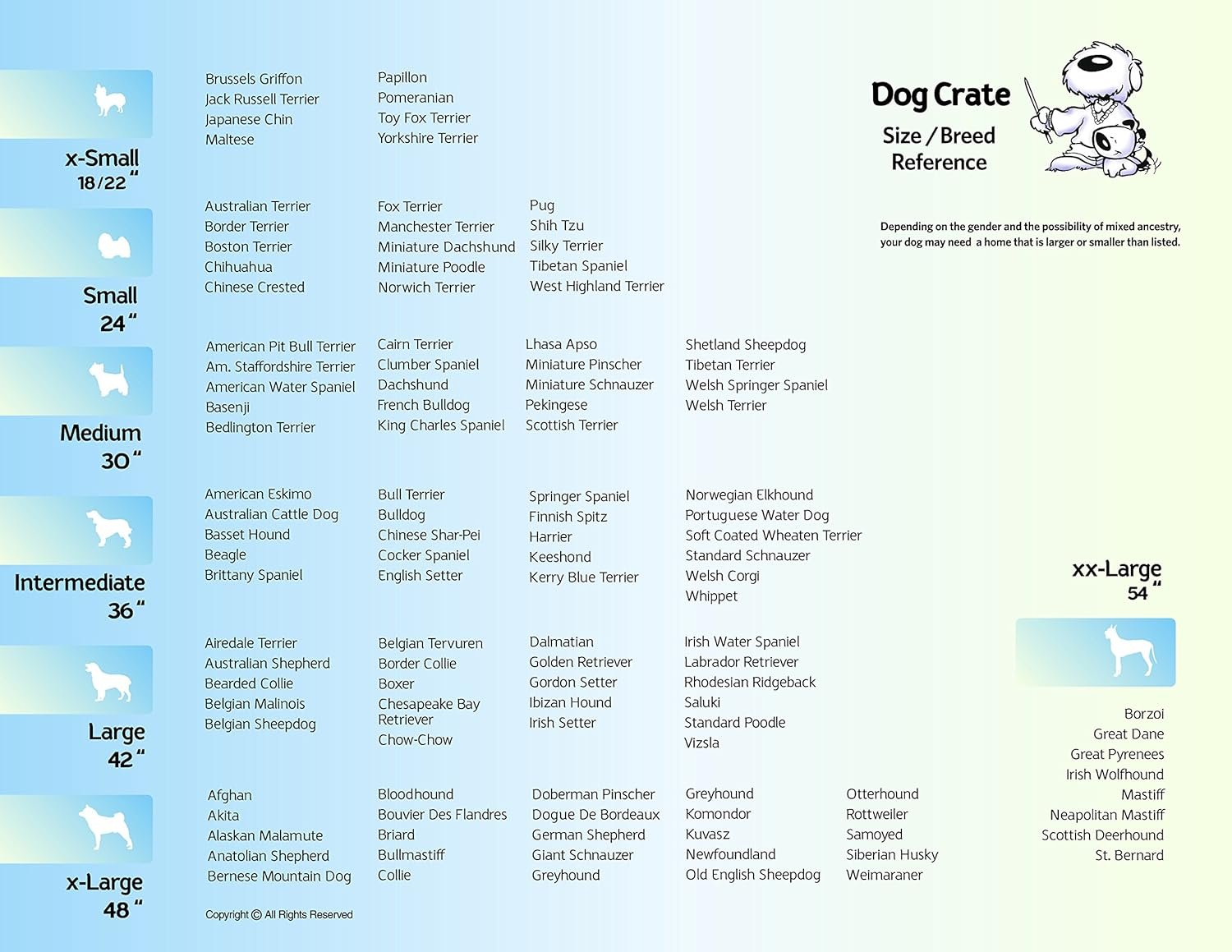Icrate hondenkrat met één deur meet 24l x 17 x 19 inch en is geschikt voor kleine hondenrassen met een volwassen gewicht van 12 tot 25 pond. Als het gewicht of de metingen van uw hond aan de hogere kant zijn voor deze krat, raden we aan de volgende kratformaat te kopen. Het wordt niet aanbevolen om een kratmat of bed te gebruiken terwijl het scheidingspaneel in gebruik is.