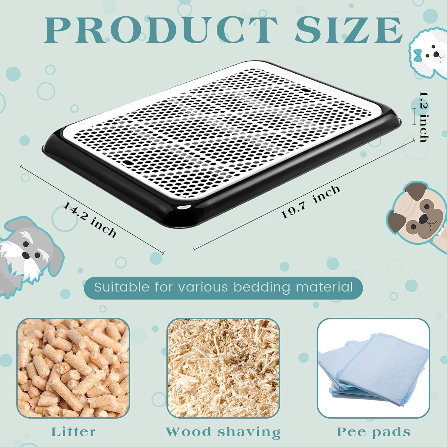 Juiste maat: het hondentoilet meet ongeveer 19,7 x 14,2 x 1,2 inch, met voldoende ruimte voor uw mooie huisdier om vrij te bewegen en te genieten van plassentijd; Bovendien zorgt het verhoogde roosterontwerp ervoor dat meer zwerfvuil en uitwerpselen binnen kunnen blijven om morsen te voorkomen, zodat u geen extra schoonmaakbeurt hoeft te doen, tijd en moeite besparen