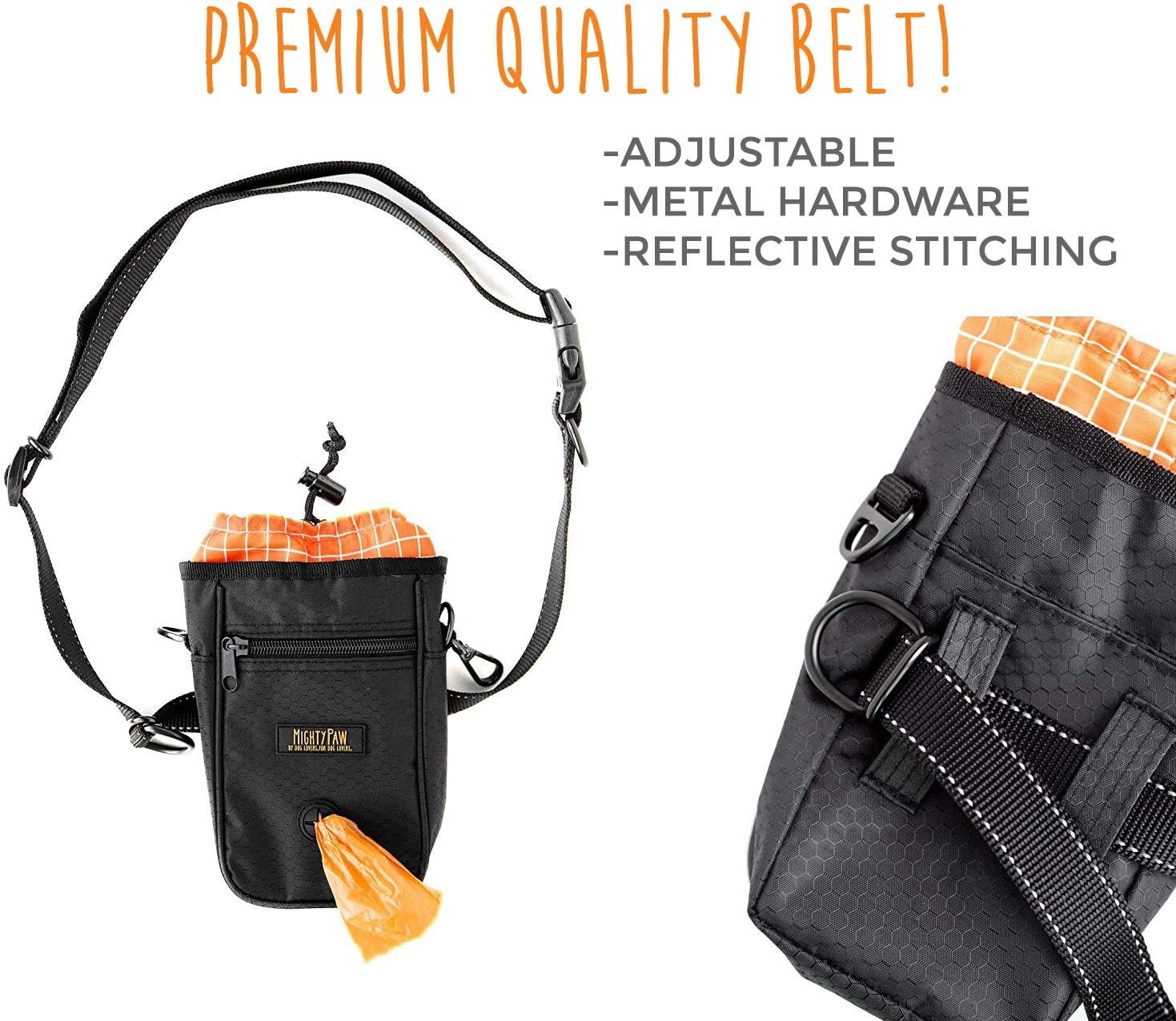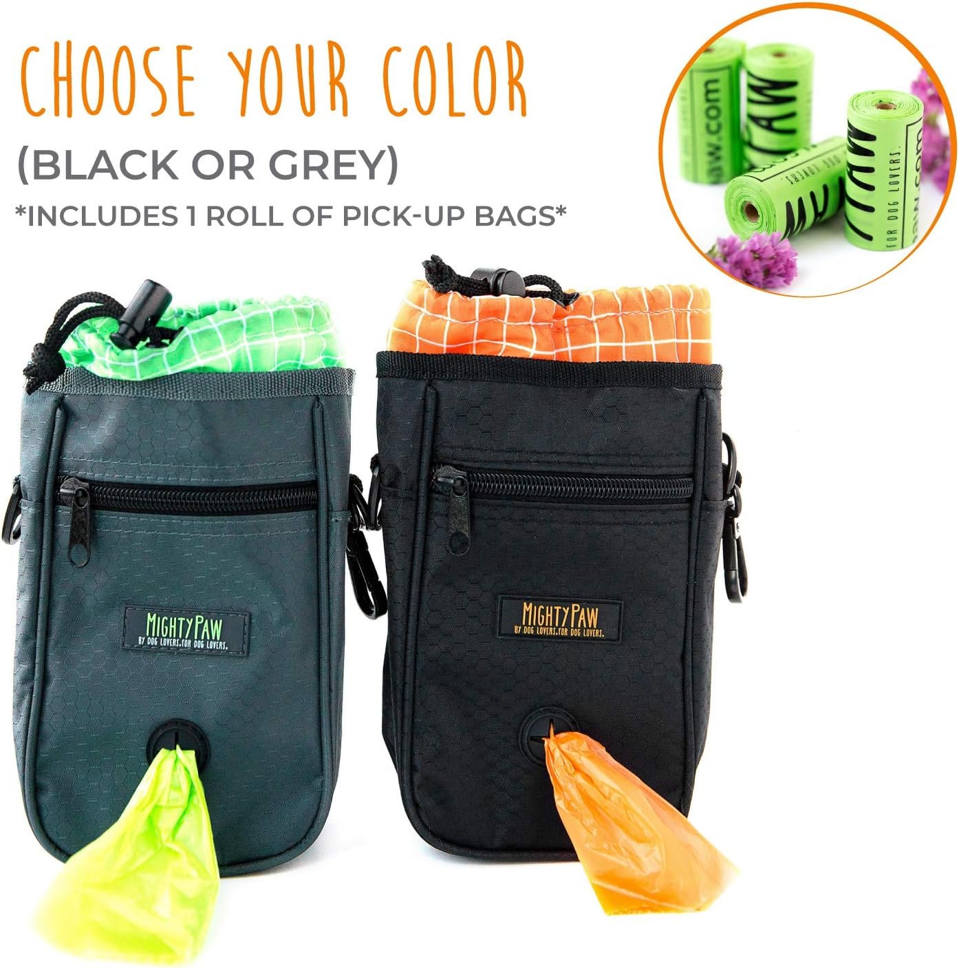 Mighty Paw Dog Treat Bag – Drawstring Sluiting Pouch – Inclusief karabijnhaak en ophaalzakken – met reflecterende riem – hondentraining traktaties zakje (zwart)