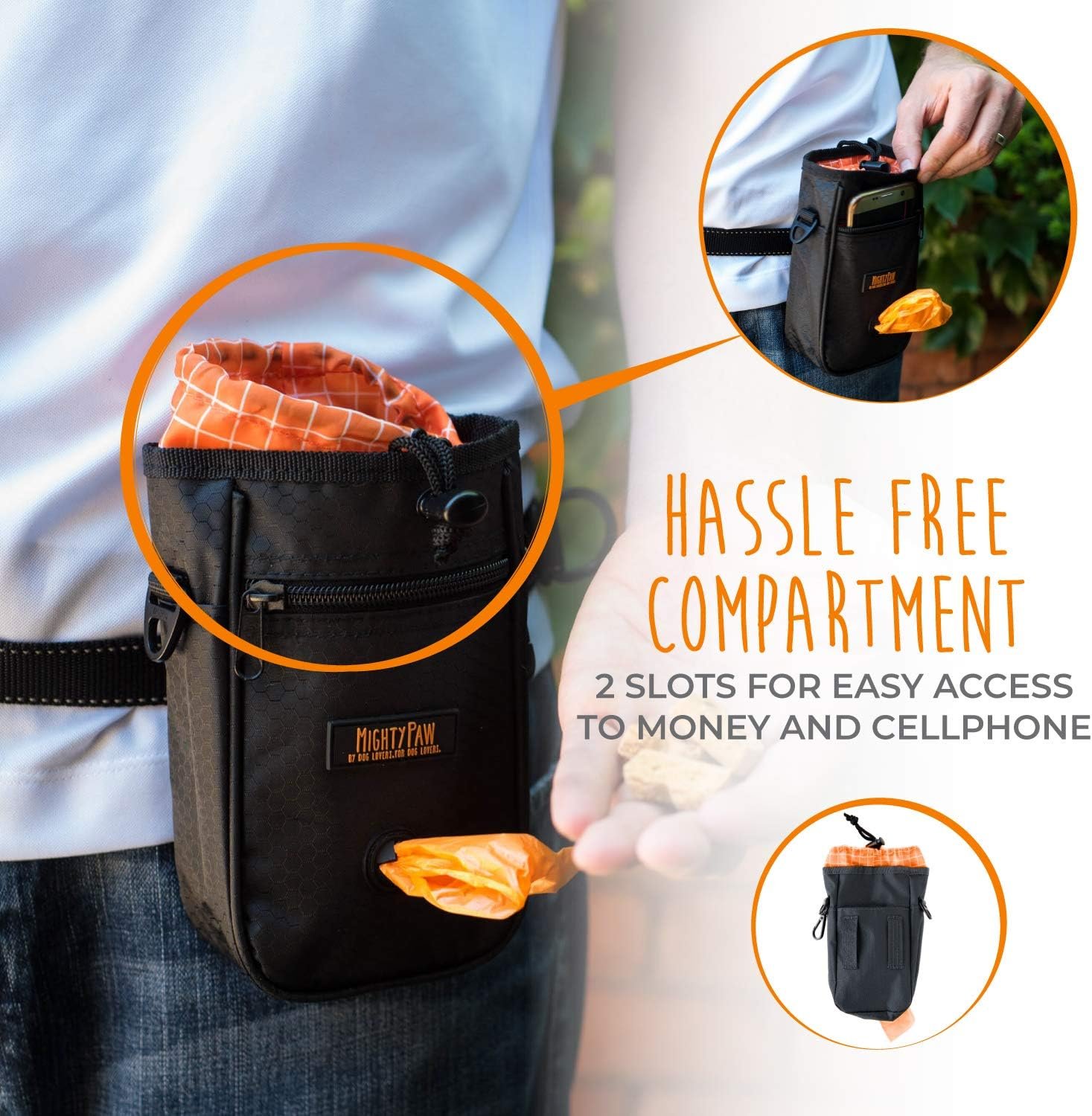 Hassle-vrije compartimenten voor bezittingen: twee compartimenten voor uw eigen bezittingen: één open slot voor gemakkelijke toegang tot uw mobiele telefoon, en één ritssluiting voor een veilige plek om uw portemonnee/geld te plaatsen. We hebben zelfs een extra carabiner -clip opgeleverd om u een plek te bieden om uw sleutels (of training van clicker) aan te sluiten.