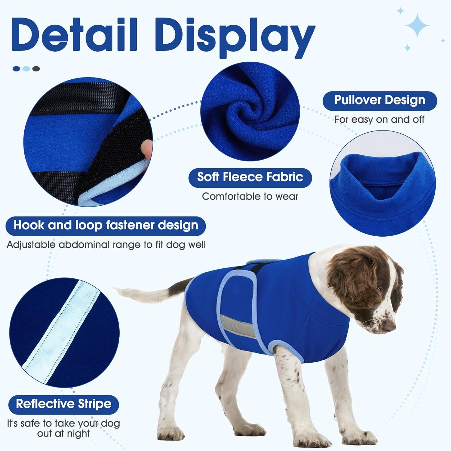 Gemakkelijk aan en uit: het pullover -ontwerp maakt onze fleece hondentrui gemakkelijk aan te trekken en op te starten, zonder ritsen of aanpassingsgespen om de vacht van je hond te vangen. Bovendien zorgt de verstelbare haak en lusbevestiging op de buik voor dat een knus past bij honden van verschillende maten.