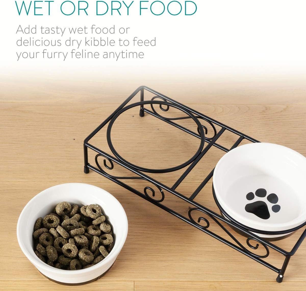 Met schattige pootafdrukken aan de onderkant van elke kom, maken de gerechten de purrfect mode -statement tijdens elke maaltijd. Het retro, romantische ontwerp van de metalen standaard voegt nog meer stijl toe aan elke maaltijd.