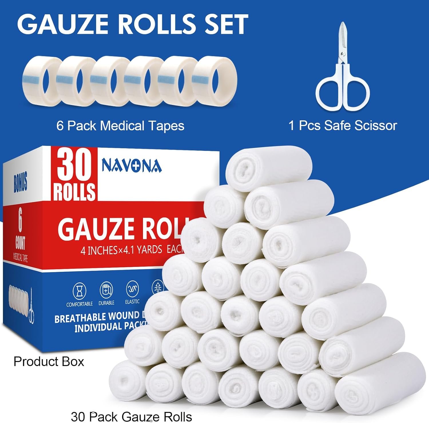 Navona 30 Pack gaasrollen verbanden, 4 in x 4,1 meter, individueel ingepakt ademend gerold gaas, mummiewraps, premium EHBO -benodigdheden en medische benodigdheden voor wonden