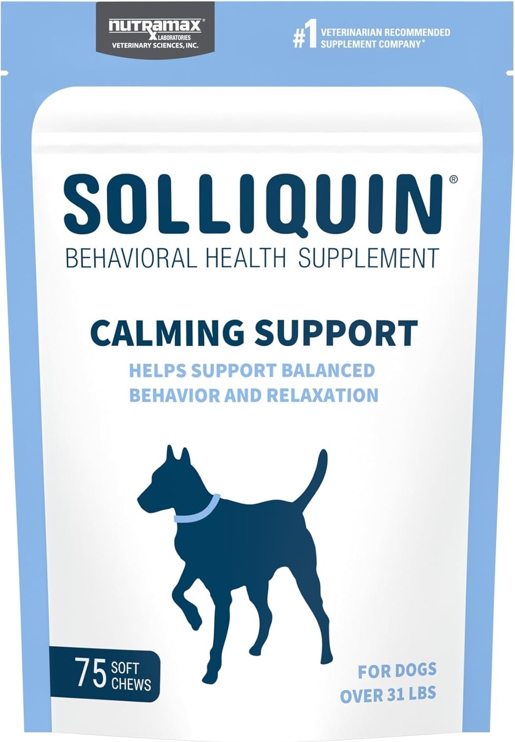 Kalmerende gedragsondersteuning voor honden: Solliquin Behavioral Health Supplementen helpen bij het ondersteunen van evenwichtig gedrag en ontspanning voor angstige of gestresste huisdieren en tijdens perioden van aanpassing in de dagelijkse routine van uw huisdier. Voor honden van meer dan 31 pond.