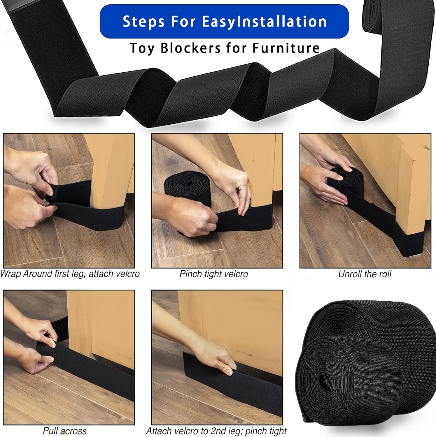 Eenvoudige installatie met lijmband: de verstelbare elastische riemen zijn ontworpen voor eenvoudige installatie. Je wikkelt eenvoudig de uiteinden van de onderbedblokkeer om de bankpoot en drukt het haakuiteinde tegen het lusoppervlak, en je bent helemaal ingesteld in minuten. Het creëert een barrière die speeltjes binnen handbereik houdt en helpt een opgeruimde leefruimte te behouden.