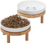 Ondiepe verhoogde kattenkommen, 5,9 inch brede verhoogde keramische kattengerechten met bamboestandaard, snorvriendelijk huisdierenwater of voedsplaatvoedingstation voor binnenkatten, kitten (wit, set van 2)
