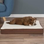 Productdetails – Materialen: Sherpa, MicroSuede, Polyurethaanschuim en geheugenschuim. Afmetingen: (l) 30 “x (w) 20,5” x (h) 4 “. Het hondenbed met wasbare dekking ondersteunt honden met een gewicht van 20-45 pond. Kleur: bruin.