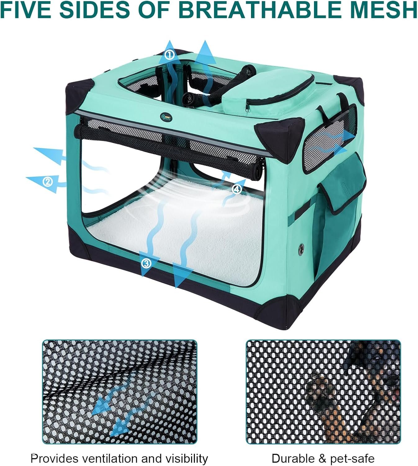 Ademend en zichtbaar: de Soft Dog Crate heeft vier gaasvensters aan alle kanten, wat een goede ventilatie en zichtbaarheid biedt voor uw huisdier. De ramen zijn gemaakt van duurzame mesh -stof en kunnen volledig worden geopend of gesloten om de luchtstroom te regelen.