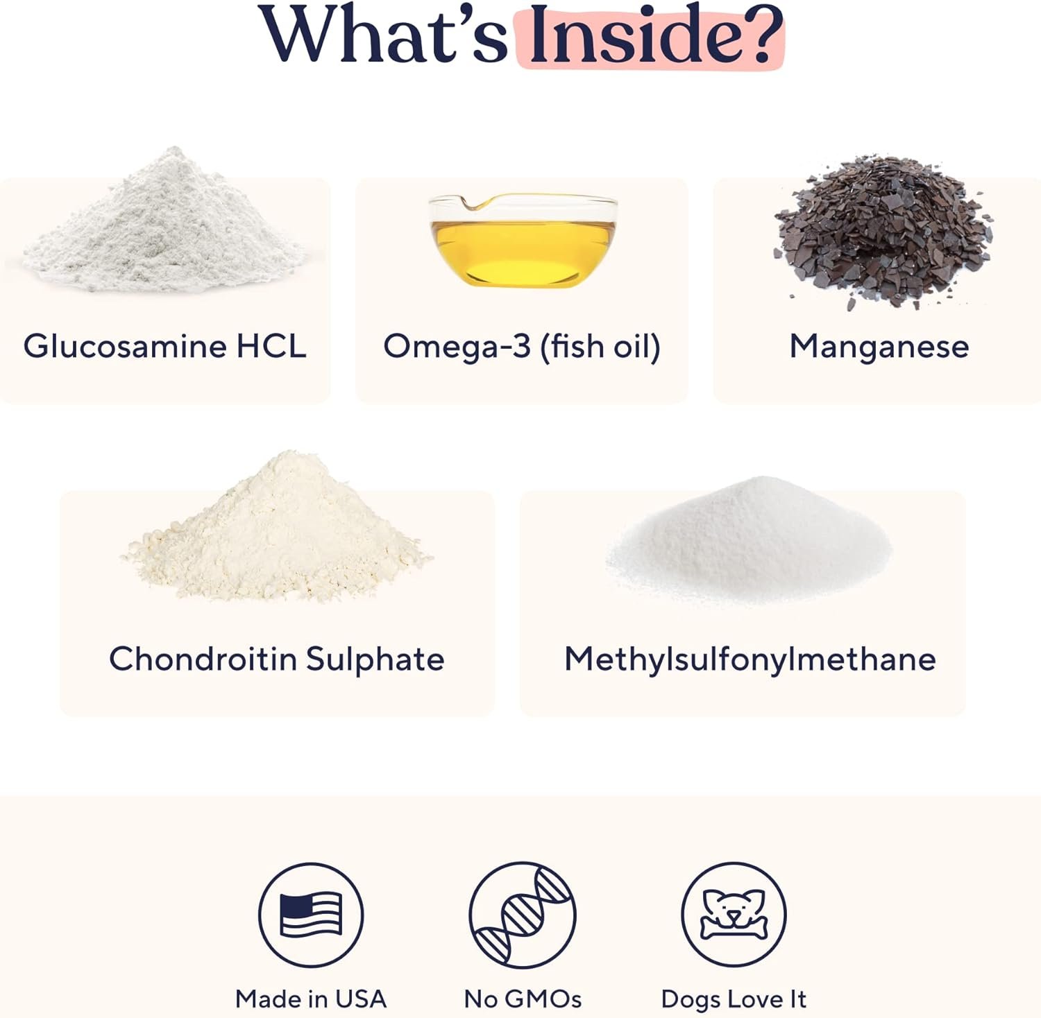 Hip- en gewrichtsingrediënten: Glucosamine HCL, Omega 3, Mangaan, Chrondroïtinesulfaat, Hip- en gewrichtsingrediënten: Glucosamine HCL, Omega 3, Mangaan, Chrondroïtinesulfaat,