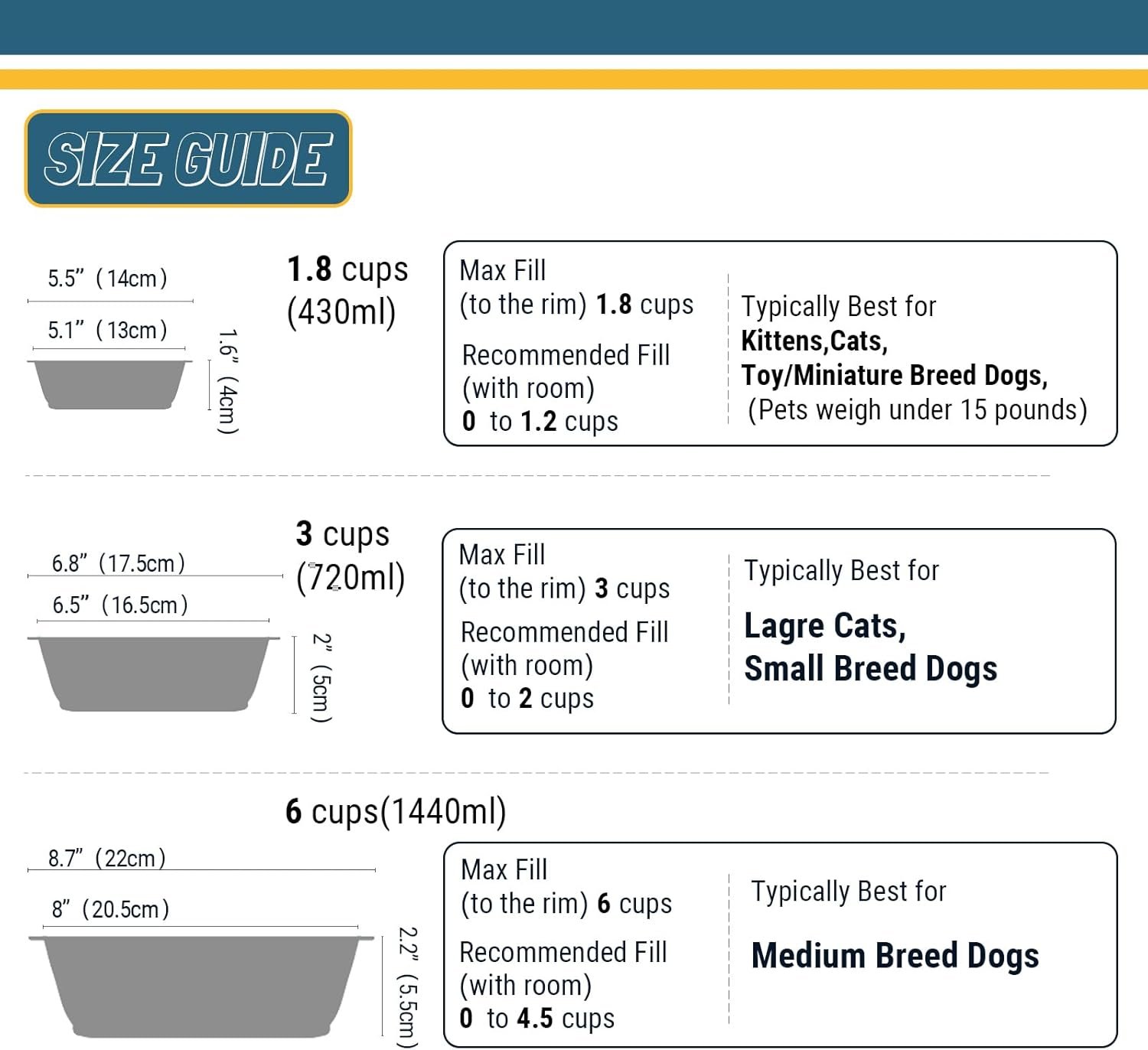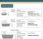 Dimensie en capaciteit: diameter 6.5 ” (w/ out lip), diameter 6.8 ” (w/ lip), hoogte 2 ”. Capaciteit: 3 kopje. Goed voor huisdieren minder dan 20 pond