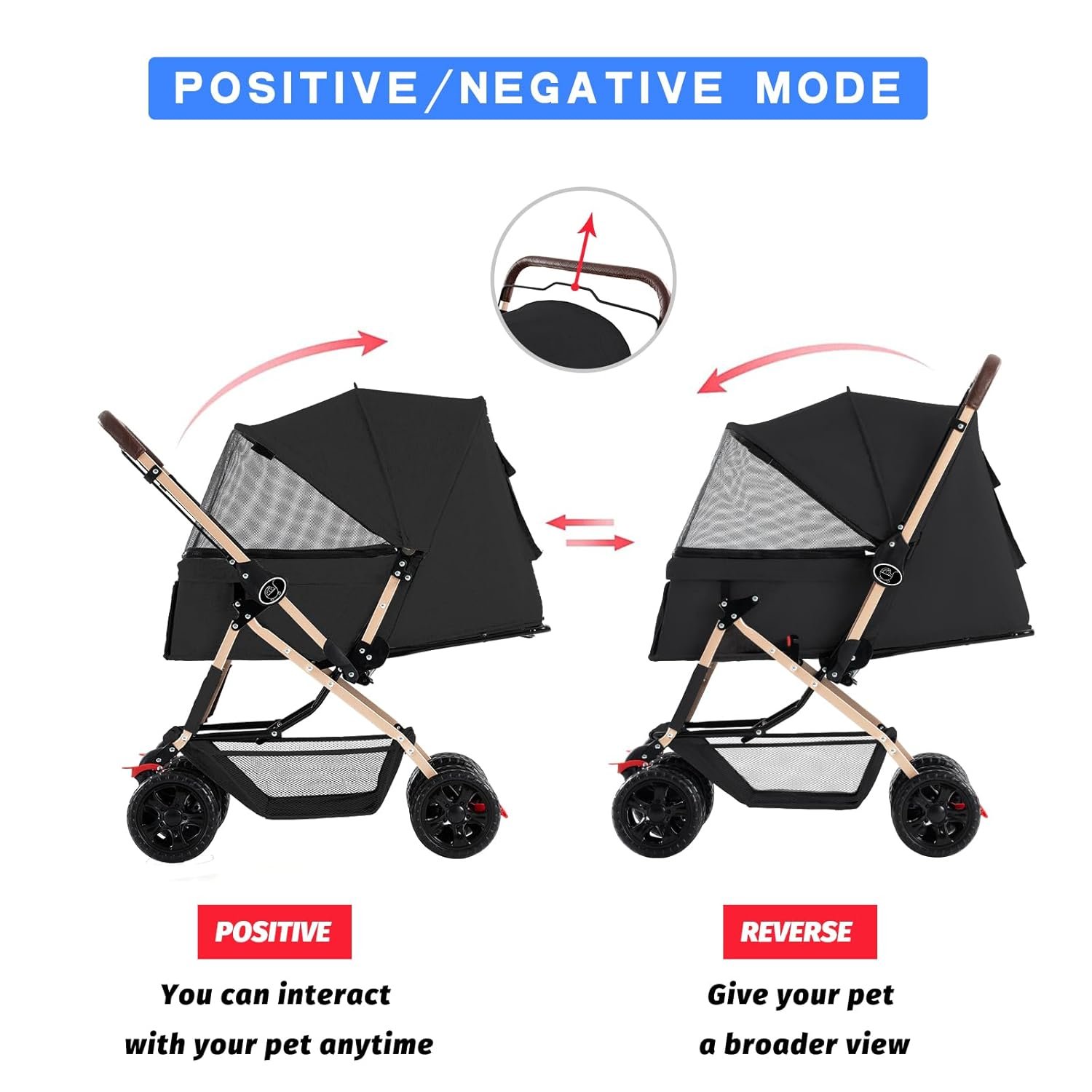De richting van het handvat kan heen en weer worden gewijzigd volgens uw behoeften, deze omkeerbare functie kan huisdieren een visuele ervaring in verschillende richtingen bieden.
