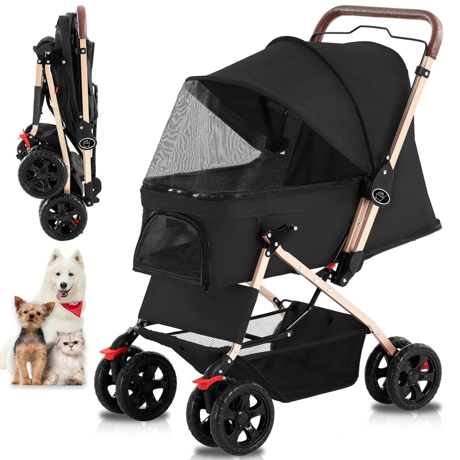 Pet Dog Stroller voor katten en honden vier wielen drager wandelen met een weerkar met weerbekleding, met opslagmand voor kleine middelgrote honden en katten (zwart)