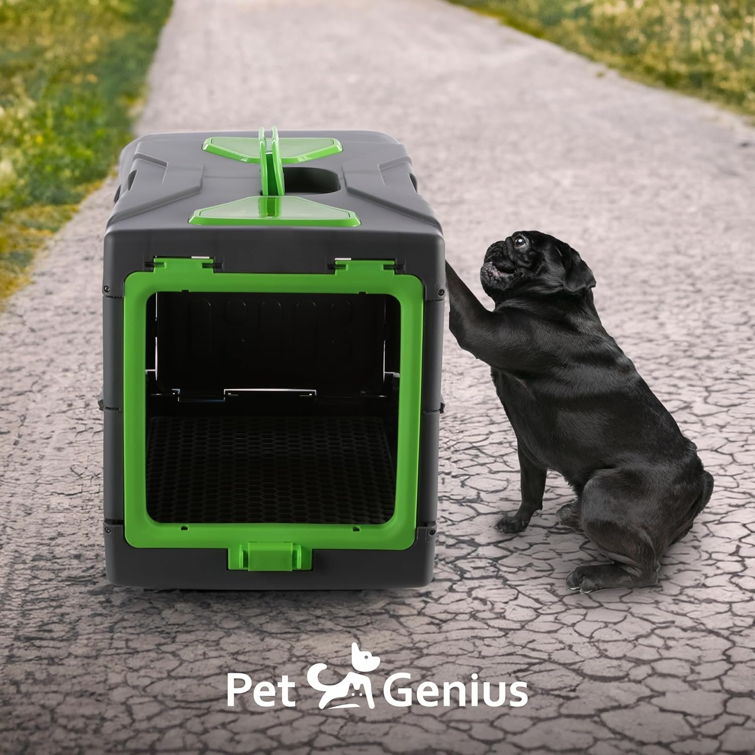 Pet Genius Inklapbare huisdier krat, ultra-lichtgewicht draagbare kennel met dubbele scharnierdeur, vouwt tot 6 inch, weegt 6,5 pond, meerdere ventilatieopeningen en ramen voor thuis en onderweg, 22x13x14.5, groen