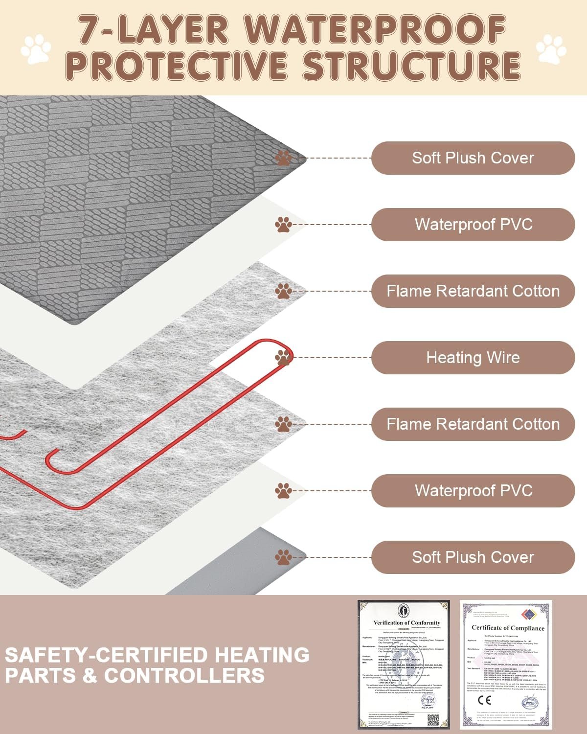 Geavanceerde 7-laags bescherming: ons PET-verwarmingskussen heeft een 7-laags beschermende structuur, die een zacht fluwelen deksel combineert met een waterdichte PVC-behuizing. Binnen voegen refractaire wol en UL-gecertificeerde verwarmingsdraad duurzaamheid toe. De PVC-laag heeft een V-0 vlamvertragende beoordeling, die brandbeveiliging op topniveau biedt. Dit meerlagige ontwerp biedt uitgebreide veiligheid, waardoor het een veilige en geruststellende keuze is voor uw huisdier.