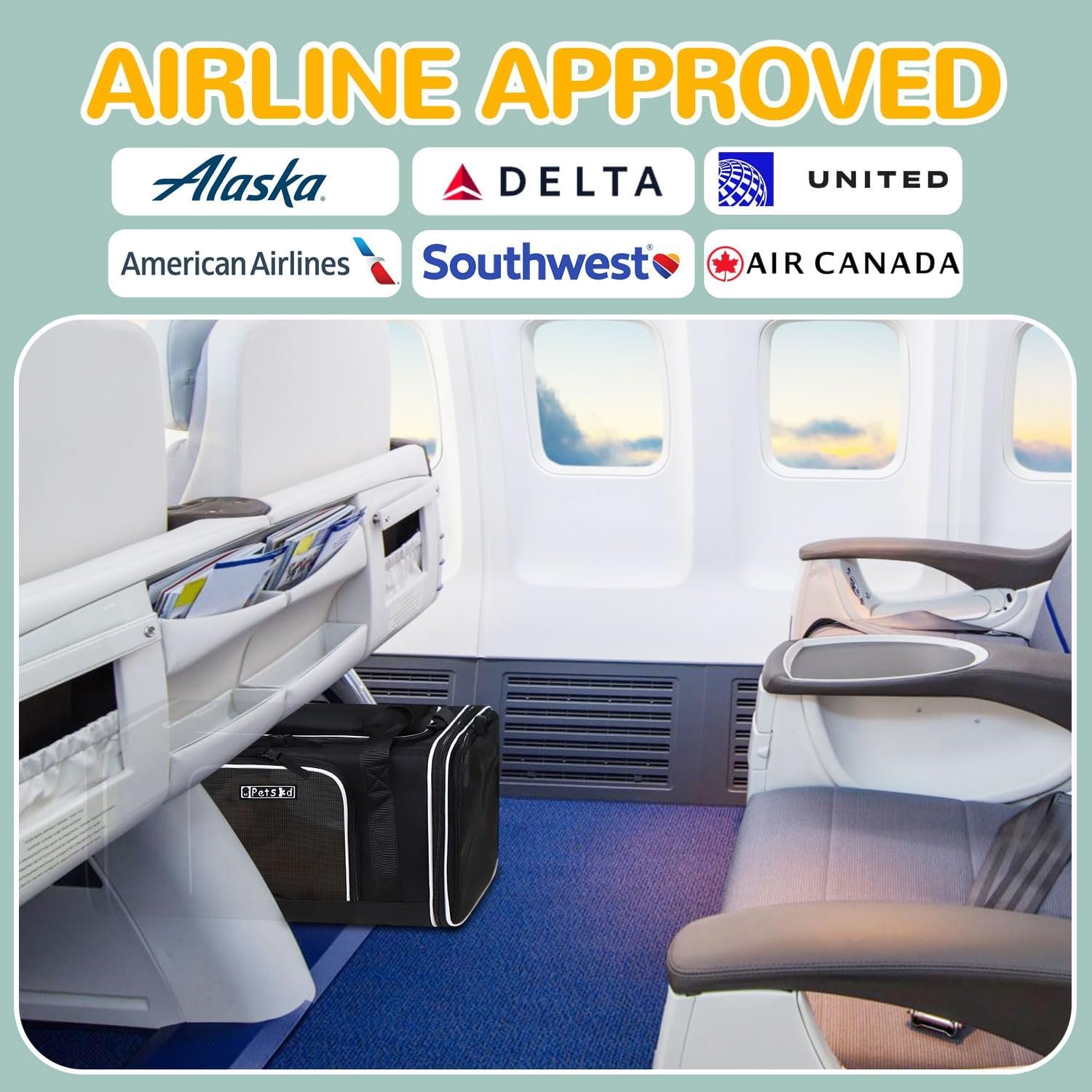 【Airline goedgekeurde vervoerder】 Ongevouwen grootte: (17+3) “L × 11” W × 9,5 “H, Petskd Pet Carrier is goedgekeurd door luchtvaartmaatschappijen en kan worden geplaatst onder de stoel in de cabine, het is voornamelijk ontworpen voor ①alaska luchtvaartmaatschappijen, maar Ook in overeenstemming met ②Southwest Airlines ③Delta Airlines ④ United Airlines ⑤Armanican Airlines ⑥air Canada. raad je aan deze koerier te kopen wanneer je vliegt met de bovengenoemde luchtvaartmaatschappijen.