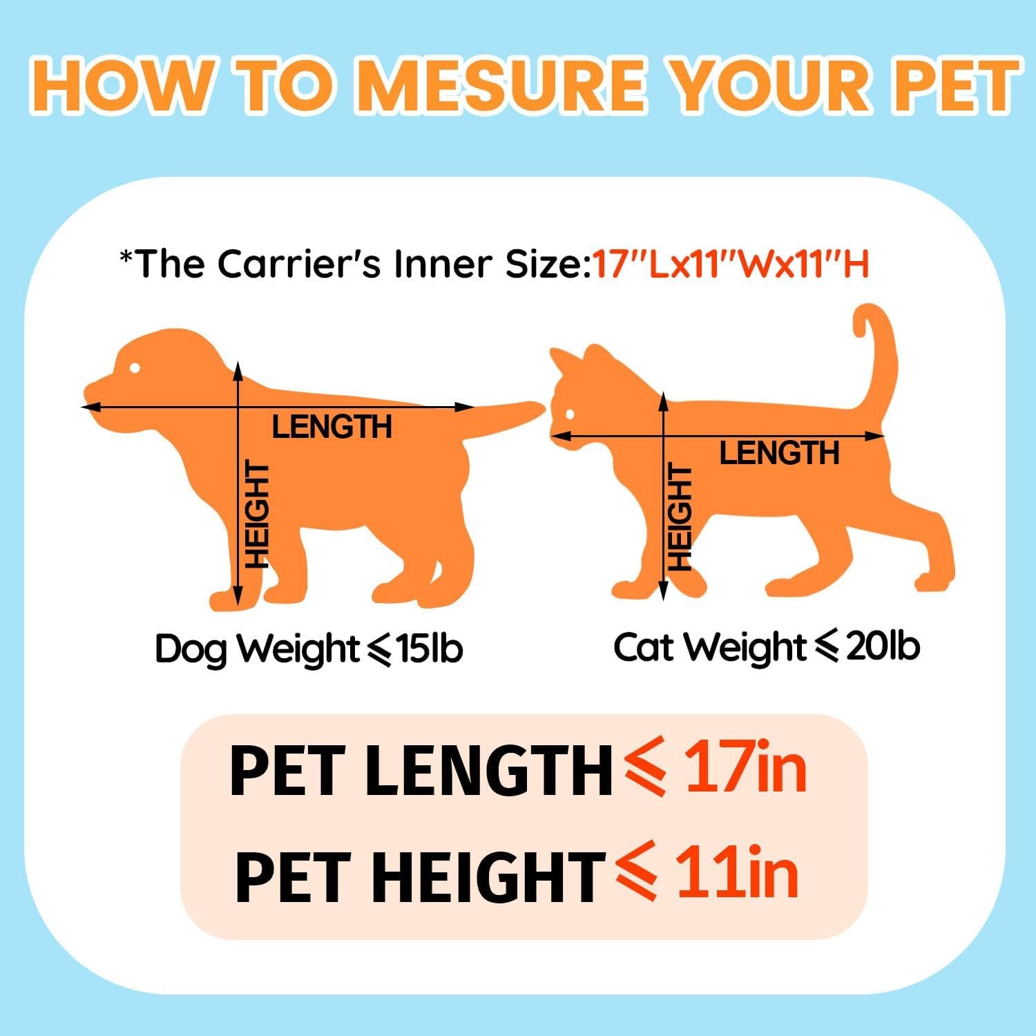 【Controleer de grootte voordat u】 koopt om te passen bij de afmetingen onder de zitplaatsen van luchtvaartmaatschappijen, deze drager kan alleen passen bij kleine honden. We raden aan dat het huisdiergrootte dat u bij zich draagt binnen 17 “L x 11” W x 11 “H, hondengewicht onder 15 pond en kattengewicht onder 20 pond is. Kies niet alleen de drager op basis van gewicht, maar verwijs ook naar de lengte van uw huisdier en hoogte.