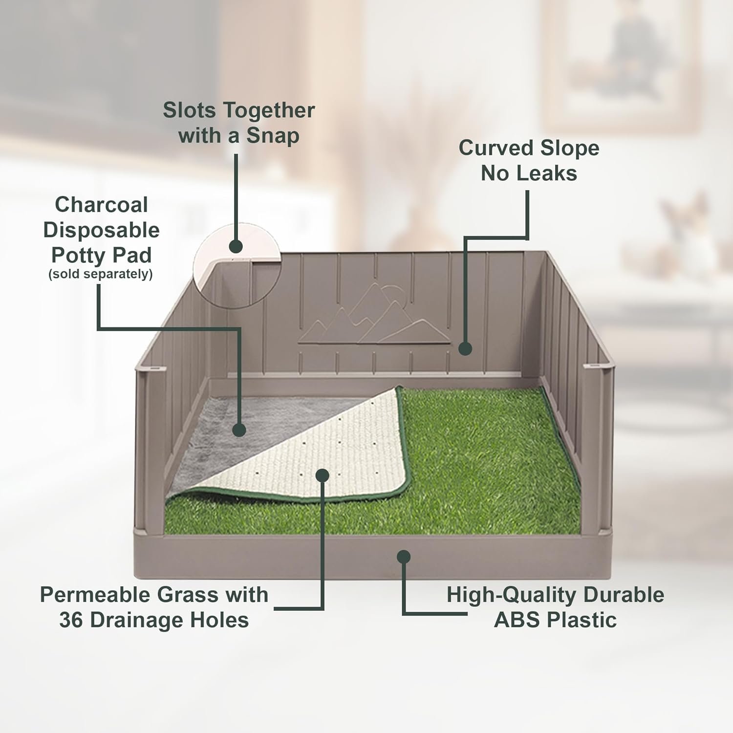 Clip drie van de vier muren in de Baselay uit een absorberend plaskussen op de bodem (afzonderlijk verkocht) Plaats gras bovenop Pee Pad