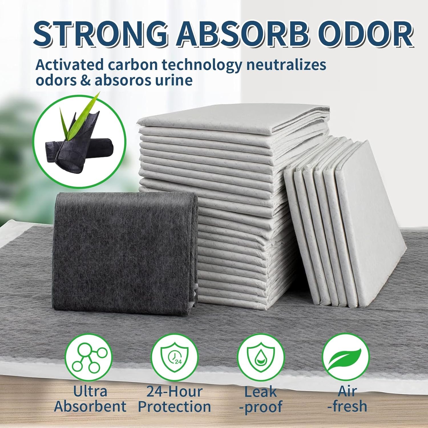 ????????【 Geactiveerde koolstof plas pads】 Geactiveerde houtskool is geweldig om geuren te elimineren, zodat uw huis de hele dag door fris, schoon en geurvrij blijft, we voegen speciaal geactiveerde koolstof toe aan hondentrainingskussens om geuren te elimineren. Zeg afscheid van de onaangename geur bij het doen van zindelijkheidstraining of zorg voor incontinentie puppy.